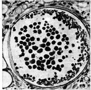 В поражённых тканях на фоне хронический воспаления, наряду с плазматическими клетками, эозинофилами, лимфоцитами и иногда гигантскими клетками типа Лангханса, видны спорангии — толстостенные округлые образования диаметром до 350 микрометров, наполненные эндоспорами (рисунок), а также отдельные споры (диаметром 7—9 микрометров). Возможны микроабсцессы с некрозами в очагах.