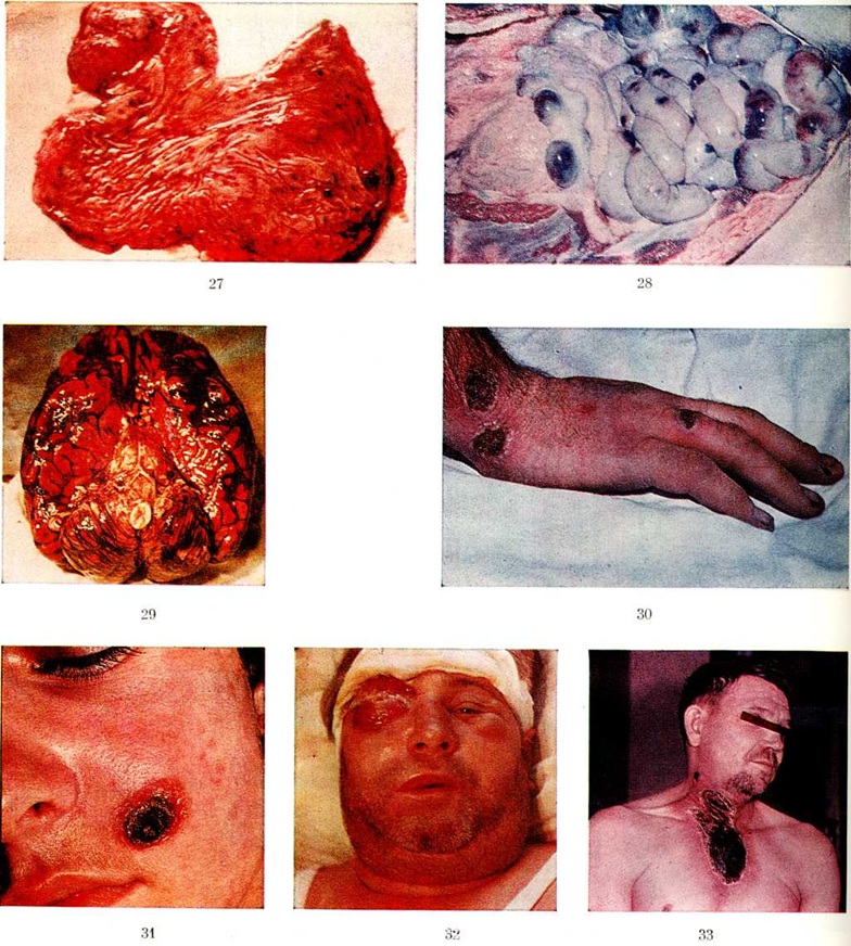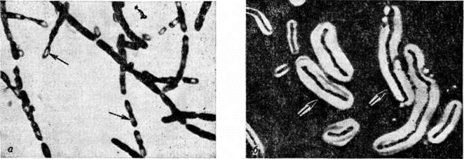 В нашей стране после Великой Октябрьской социалистической революции были созданы условия для снижения инфекционные заболеваемости, в том числе и заболеваемости Сибирская язва Перестройка промышленности и сельского хозяйства на социалистических принципах, создание совхозного и колхозного животноводства, проведение плановых противоэпизоотических мероприятий, и прежде всего иммунизации животных, привели к значительному сокращению Сибирская язва среди животных. Коренное улучшение ветеринарно-санитарного надзора (смотри полный свод знаний) за животными, убоем скота и санитарный надзора за предприятиями по переработке животного сырья привело к резкому уменьшению заболеваемости и среди людей. Стабильное снижение заболеваемости Сибирская язва людей в нашей стране происходило на фоне ежегодного увеличения поголовья с.-х. животных. Заболеваемость стала спорадической и утратила строгую сезонность. Начиная с 60-х годы 20 век заболеваемость Сибирская язва населения СССР снизилась до нескольких сотен случаев в год. Этиология. Возбудитель Сибирская язва— сибиреязвенная бацилла (Вас. anthracis Cohn 1872) — относится к семейство Bacillaceae. Бацилла Сибирская язва— крупная неподвижная палочка длиной 6—10 микрометров, шириной 1 —1,5 микрометров, грамположительная; окрашивается всеми анилиновыми красками. В неокрашенном материале от павшего животного палочки выглядят прозрачными, с закруглёнными концами, располагаются попарно или короткими цепочками, окружены прозрачной капсулой; в окрашенных мазках концы их представляются обрубленными. В мазках из культуры, выросшей на питательной среде, бациллы расположены длинными цепочками. Различают две формы существования возбудителя: вегетативную и споровую. Вегетативная форма развивается в живом организме или в молодых лабораторный культурах. Вне организма (в почве) или в культурах старше 18 часов при доступе кислорода и при температуре среды от 15° до 43° в центре каждой палочки образуется спора (смотри полный свод знаний: Споры), сильно преломляющая свет и не деформирующая поперечника палочки (рисунок, а). Спорообразование является родовым признаком возбудителя, однако в природе встречаются и аспорогенные варианты. Возбудитель Сибирская язва образует специфическую белковоподобную антигенную капсулу, состоящую из полипептида D-изомера глутаминовой кислоты. Капсула является фактором патогенности: она образуется только в восприимчивом к Сибирская язва организме животного или человека или на искусственных кровяных или сывороточных средах в атмосфере углекислого газа (рисунок, б). Бациллы Сибирская язва хорошо растут на мясопептонных средах при оптимальной t° 35—37°, при температуре ниже 12° и выше 45° роста не отмечается, оптимальный pH среды 7,2— 8,6. На мясопептонном агаре через одни сутки роста образуются серебристо-серые зернистые колонии 3—5 миллиметров в диаметре, с бахромчатым краем, состоящим из переплетений цепочек микроба (R-форма). Под небольшим увеличением края шероховатых колоний напоминают голову медузы или львиную гриву. В мясопептонном бульоне рост в R-форме характеризуется образованием придонного осадка, напоминающего комок ваты; бульон остаётся прозрачным. Капсулообразующие штаммы при посеве на сывороточные среды в атмосфере углекислого газа неизменно образуют гладкие ил
