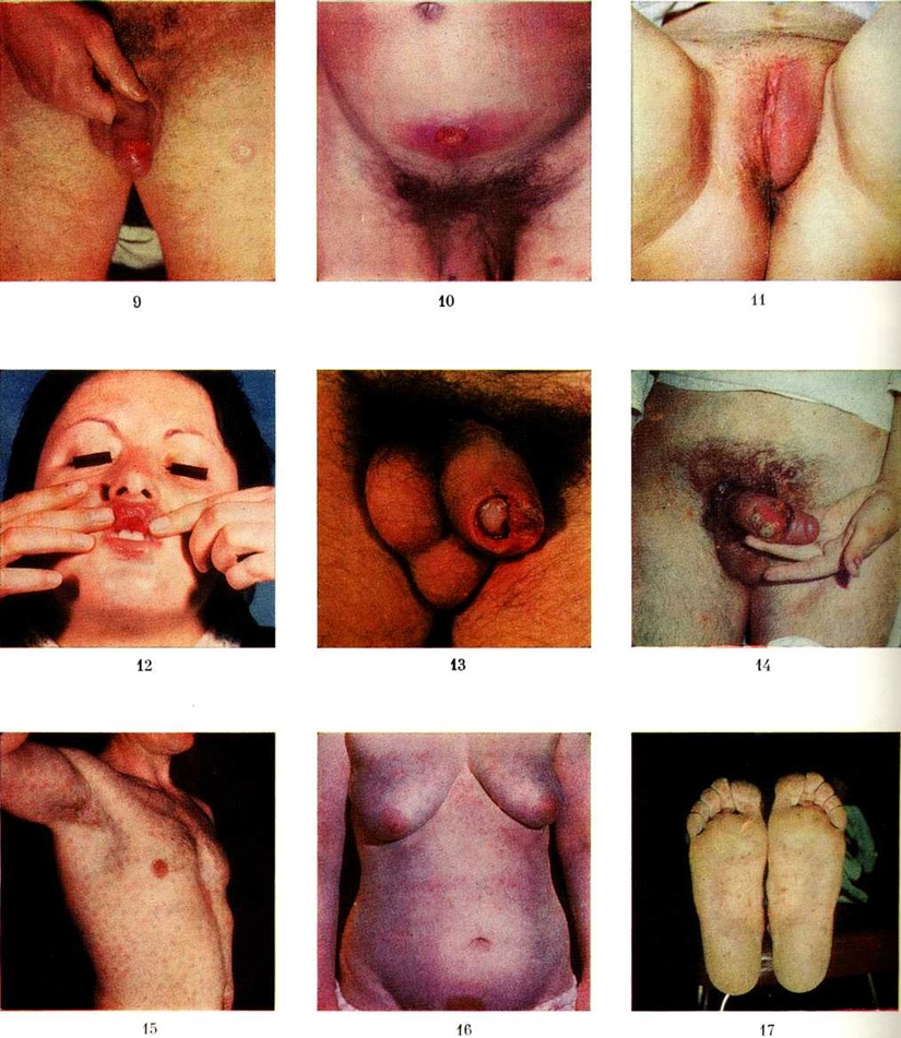 К вероятным признакам, позволяющим ставить диагноз позднего врождённого Сифилис лишь при наличии подтверждающих данных (анамнез; результаты клинического и серологического обследования ребёнка и матери, изменения в цереброспинальной жидкости), относятся симптом Робинсона — Фурнье, саблевидные голени — искривление большеберцовых костей вперёд (рисунок 6), деформация носа (седловидный, лорнетовидный, «козлиный» нос), ягодицеобразный череп, кисетообразные и почкообразные зубы. Симптом Робинсона—Фурнье возникает в результате перенесённого в грудном Возрасте диффузного сифилида и проявляется белесоватыми тонкими рубцами в виде сетки или линейных полос, радиарно расположенных вокруг губ, углов рта, на подбородке. Их следует дифференцировать -с рубчиками после ожогов, пиодермий, кандидоза, герпетиформной экземы Капоши (смотри полный свод знаний: Вакцинные сыпи). Саблевидные голени возникают после перенесённого в грудном возрасте остеохондрита. Ложные саблевидные голени возможны при приобретённом Сифилис после перенесённого остеопериостита и при болезни Педжета. К стигматам (дистрофиям) относится симптом Авситидийского, описанный им в 1891 год (утолщение грудинного конца ключицы, чаще правой, возникающее из-за диффузного гиперостоза), дистрофия костей черепа в виде увеличения теменных и лобных бугров, высокое («готическое», или «стрельчатое») твёрдое небо, аксифоидия (отсутствие мечевидного отростка грудины), бугорки Карабелли (наличие пятого добавочного бугорка на жевательной поверхности 1-го моляра верхней челюсти), диастема Гоше (широко расставленные верхние резцы); инфантильный мизинец, гипертрихоз (зарастание волосами лба почти до бровей и усиленный рост волос); асимметрия ушных раковин. Диагноз врождённого Сифилис устанавливают на основании клинико-серологического обследования с учётом возрастных особенностей. В диагностике скрытых (латентных) форм или при слабо выраженной симптоматике, особенно у детей грудного возраста, существенную роль играют данные анамнеза (анализ давности заболевания матери, качество лечения её до и во время беременности), результаты серологических реакций у ребёнка, в том числе РИБТ и РИФ и рентгенографического исследования костей, а также осмотр глазного дна. При активном раннем врождённом Сифилис серологические реакции положительны у 95—100% больных. При врождённом Сифилис раннего детского возраста серологические реакции крови обычно положительны. Диагноз позднего врождённого Сифилис устанавливают на основании наличия безусловных признаков, сопоставления вероятных признаков и стигмат с клинические, проявлениями Сифилис (поражение внутренних органов, нервной системы, кожи и слизистых оболочек), а также с анамнезом, положительными серологический реакциями крови. Классические серологические реакции положительны у 70—92% больных, а РИБТ и РИФ — почти у 100%. Для диагноза скрытого позднего врождённого Сифилис важен анамнез (сифилис у матери) и наличие положительных серологических реакций крови, в том числе РИБТ и РИФ. Для дифференциальной диагностики скрытых форм врождённого Сифилис у новорожденных с ложноположительными серологическими реакциями большое значение имеет РИФ с IgM, а также РИБТ, которые, как правило, положительны у детей, больных врождённым Сифилис Лечение. Детя