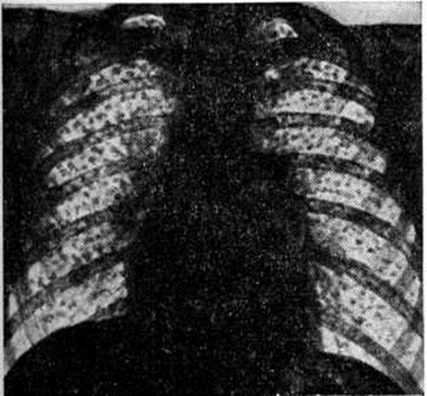 Определённая роль отводится индивидуальной предрасположенности, возможно связанной с генетическими особенностями организма, в том числе и иммунного гомеостаза. Патологическая анатомия. Силикоз характеризуется развитием специфических прогрессирующих клеточно-пылевых и фиброзных силикотических узелков в лёгких и регионарных лимфатических, узлах на фоне диффузных интерстициальных изменений, реже в верхних дыхательных путях, трахее, бронхах, исключительно редко в других органах. Силикотический узелок в начале процесса отличается концентрическим или вихреобразным расположением аргирофильных, в дальнейшем плотных гиалинизированных коллагеновых волокон, полностью вытесняющих кониофаги. Эти узелки могут быть милиарными при диффузной форме Силикоз Группы их, сливаясь, образуют в лёгких крупные узлы плотной серо-беловатой ткани (узелковая, узловая и опухолевидная формы), иногда с распадом (силикотические каверны), иногда с отложением извести в центре или по периферии узлов; узелки могут развиваться также вокруг сосудов, сдавливая их. На сподограммах (смотри полный свод знаний) или в косо падающем свете тёмного поля микроскопа в силикотических узелках, особенно по периферии, обнаруживаются светящиеся кварцевые пылинки. При Силикоз, как правило, развиваются слипчивый плеврит, хронический преимущественно атрофический бронхит, диффузный интерстициальный пневмосклероз (смотри полный свод знаний), эмфизема лёгких (смотри полный свод знаний). Больные погибают от сердечно-лёгочной недостаточности при лёгочном сердце и мускатной печени или от присоединившегося туберкулёза. Клиническая картина. В 1930 год на 1 Международной конференции по силикозу в Йоханнесбурге была принята классификация Силикоз, учитывающая как рентгенологическое данные, так и клинические, симптоматику. Эта классификация получила широкое признание в ряде стран. В последующих международных классификациях учитываются и детализируются преимущественно рентгенологические (скиалогические) признаки заболевания (характер и плотность затемнений на рентгеновском снимке). В классификациях, принятых в СССР для всех пневмокониозов, в том числе и для Силикоз (1958 и 1976), учитывались, наряду с рентгенологическими клинические, признаки болезни. Последняя и ныне действующая классификация предусматривает три стадии (I, II, III) и три формы Силикоз (узелковую, интерстициальную и узловую). Узелковая форма Силикоз (рисунок 1) характеризуется наличием в лёгких мелких округлых чётко очерченных однотипных теней. В зависимости от фазы развития узелка (клеточная, фиброзная фаза, фаза гиалиноза или кальциноза) меняется интенсивность и гомогенность узелковых теней. По величине выделяют 3 типа узелков: до 1,5 миллиметров (р), от 1,5 до 3 миллиметров (q), от 3 до 10 миллиметров (г). При интерстициальной форме Силикоз определяются усиление и деформация лёгочного рисунка, обусловленные периваскулярным и перибронхиальным фиброзом. По характеру интерстициальных изменений выделяют тонкие линейно-сетчатые изменения лёгочного рисунка (s), тяжистые, неправильные линейные тени (t), груботяжистые, неправильные, местами ячеистые мелкопятнистые затемнения (и). Линейно-тяжистые изменения наблюдаются с двух сторон, имеют диффузный распространённый характер, что наиболее выражено в средних и нижни