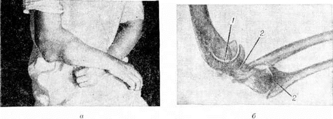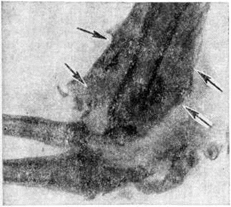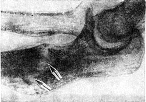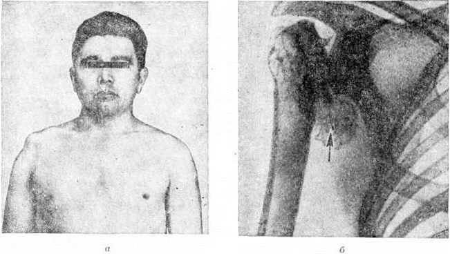 Остеоартропатии при Сирингомиелия развиваются преимущественно в верхней конечности. Чаще встречается поражение одного сустава, но в редких случаях наблюдаются изменения и нескольких суставов (смотри полный свод знаний: Артропатия). В развитии остеоартропатии при Сирингомиелия рентгенологически различают три стадии — латентную, стадию разрушения (преимущественно литического) и стадию реактивных изменений (преимущественно гиперостотических). Латентная стадия проявляется остеосклерозом (смотри полный свод знаний) прилежащих к суставным поверхностям отделов костей, узурацией субхондральных отделов, сужением суставной щели вследствие истончения хрящевого покрова или её расширения вследствие накопления выпота. В дальнейшем появляются отломы краёв эпифизов, рассасывание ближайших к суставам отделов костей, причём часто исчезают целые эпифизы, метафизы и даже части диафизов. Наряду с остеолитическими процессами возникают и выраженные гиперостотические изменения в виде чрезмерных, причудливой формы напластований костной ткани, окостенений мягких околосуставных тканей. Разрушение и созидание костной ткани происходит беспорядочно, хаотично. Одновременно появляются изменения и в связочном аппарате — расслабляются суставная капсула, связки, что способствует чрезмерной подвижности в суставе, разболтанности, резко выраженному смещению костей сустава — патологический Вывиху (смотри полный свод знаний). Различают две формы остеоартропатий — остеолитическую и гиперостотическую, которые протекают соответственно с преимущественно деструктивными, литическими, изменениями или с гиперостозом (смотри полный свод знаний) — значительным костеобразованием, с причудливым утолщением кости и уплотнением её структуры (рисунок 4). При Сирингомиелия чаще всего поражаются локтевые суставы, несколько реже — плечевые. Лучезапястные и межфаланговые суставы поражаются редко. В пальцах кисти встречаются изменения главным образом в виде остеолиза ногтевых фаланг, а также разрушения межфаланговых суставов. Наиболее выраженные изменения наблюдаются в костях локтевых суставов. В плечевых суставах деструктивные костные изменения менее выражены, чаще они проявляются частичной деструкцией головки плечевой кости и суставной впадины лопатки (рисунок 5). Обычно, несмотря на большие деструктивные костные изменения, остеопороз не отмечается. Поражение суставов в виде остеоартропатий при Сирингомиелия часто сопровождается обызвествлением и окостенением причудливой формы и различной плотности мягких, главным образом околосуставных, тканей, в ряде случаев чрезвычайно обильным. Кроме остеоартропатий, при Сирингомиелия наблюдаются и остеопатии — трофические внесуставные изменения в диафизах длинных трубчатых костей, главным образом в костях предплечья, в виде локальных гиперостоза и рассасывания, приводящих к патологический переломам и образованию ложных суставов (рисунок 6). Так, иногда в локтевой кости наблюдаются зоны перестройки и остеолиза (рисунок 7), приводящие к нарушению целости кости и спонтанному перелому. Описаны своеобразные изменения скелета в виде увеличения костей кисти — так называемой хейромегалии. Нарушается психический статус, снижается память, способность к обобщению, отмечается лабильность эмоционал