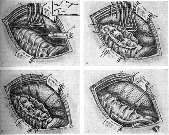 Образующиеся в результате воспаления некротические массы (казеоз) заполняют очаг деструкции в теле позвонка. Прогрессирование туберкулёзного процесса приводит к разрушению компактного вещества тела позвонка и распространению туберкулёзного процесса за его пределы. При этом в мягких тканях могут образовываться холодные (натечные) абсцессы (смотри полный свод знаний: Натечник). Возможны различные пути распространения туберкулёзного процесса из первичного очага через переднюю, заднюю и боковую поверхности тела позвонка (внедисковый путь), а также через межпозвоночный диск (внутридисковый путь). Процесс, распространяющийся внедисковым путем, приводит к обширным разрушениям позвонков. Прорываясь через переднюю поверхность тела позвонка, гной отслаивает переднюю продольную связку, распространяется под ней, образуя превертебральный абсцесс (рисунок 1, а), и вызывает контактное поражение других позвонков, так называемый поверхностную костоеду. Превертебральные абсцессы в зависимости от направления распространения гноя вызывают восходящий или нисходящий периостит (смотри полный свод знаний). При прорыве очага под заднюю продольную связку обычно возникают неврологический нарушения, обусловленные отёком спинного мозга (смотри полный свод знаний), сдавлением его гноем (рисунок 1, б), секвестрами, выступающими кзади остатками разрушенных позвонков, так называемый клином Урбана, утолщением мозговых оболочек вследствие пахименингита (смотри полный свод знаний). Характер неврологический нарушений определяется локализацией процесса и механизмом сдавления спинного мозга. При прорыве гноя через боковые поверхности тела позвонка образуются паравертебральные абсцессы, которые распространяются преимущественно в стороны от позвоночника и потому в меньшей степени контактно поражают тела соседних позвонков. В грудном отделе позвоночника такие абсцессы могут принимать форму веретена, полушарий, чечевицы, шаров, или так называемый ласточкиных гнезд (рисунок 2). В нижележащих отделах — нижнем грудном, поясничном и пояснично-крестцовом — абсцессы распространяются по мышцам, прикрепляющимся к пораженным позвонкам. Так, из поясничного отдела гной может распространяться в подвздошную область и далее — через мышечную лакуну на бедро. Из пояснично-крестцового отдела наиболее типичный путь распространения по ходу грушевидных мышц в ягодичную область. При внутридисковом пути процесс распространяется вертикально в направлении межпозвоночного диска, затем вовлекается студенистое ядро, а через него контактно — соседний позвонок (рисунок 1, в). Внутридисковое распространение гноя в большинстве случаев сочетается с малой деструкцией позвонков и наклонностью к отграничению процесса. В ряде случаев абсцессы прорываются с образованием наружных или внутренних свищей (смотри полный свод знаний). Через свищи происходит опорожнение абсцессов и очагов деструкции, что временно уменьшает явления интоксикации. Однако образование свищей чревато присоединением вторичной инфекции, что значительно осложняет лечение и прогноз. Длительно существующие свищи, особенно имеющие длинный извитой свищевой ход с затеками (смотри полный свод знаний), сравнительно быстро ведут к развитию амилоидоза (смотри полный свод знаний) внутренних органо