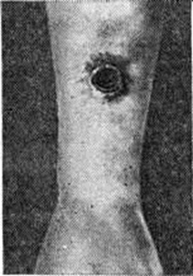 Локализованный подкожный Споротрихоз встречается наиболее часто. Вначале в подкожной клетчатке возникает безболезненный не спаянный с кожей узел размером более 0,5 сантиметров, плотноэластической консистенции. Затем он увеличивается в размерах, спаивается с кожей, которая над ним становится синюшной, некротизируется, возникает язва с подрытыми краями (рисунок 1) — споротрихозный шанкр (чаще на пальцах, кисти и предплечье), от которого по ходу отводящего лимфатических, сосуда тянется плотный тяж с множественными узелками. Вокруг шанкра и на его поверхности могут развиваться папилломатозные, бородавчатые, импетигинозные элементы. Иногда появляются бугорки и гуммозные узлы, спаянные с кожей, некротизирующиеся в центре и изъязвляющиеся,— гуммозный Споротрихоз В ряде случаев узлы не изъязвляются (туберкулоидная форма), а иногда абсцедируют или образуют при заживлении линейные или звездчатые рубцы. Могут наблюдаться аллергические сыпи — споротрихозиды.