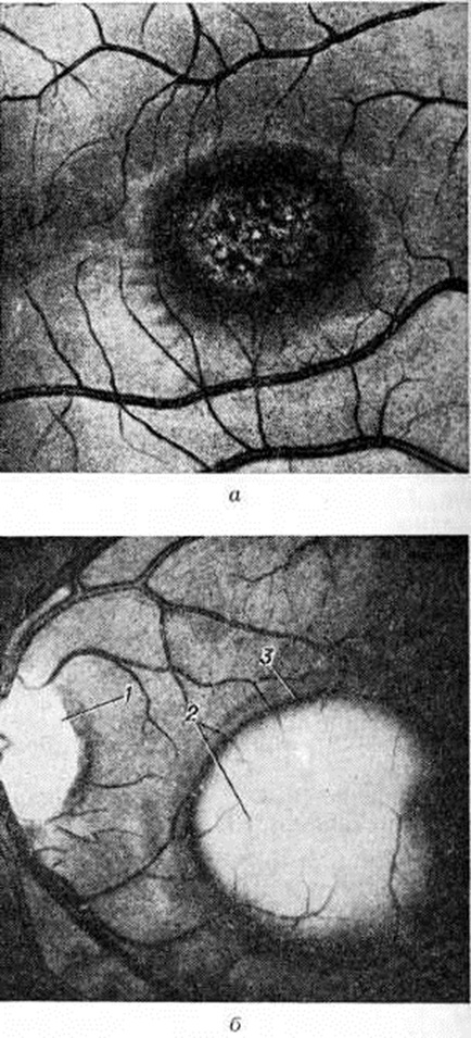 При офтальмоскопии (смотри полный свод знаний) на глазном дне обычно обнаруживают пигментные отложения в сетчатке, восковидную атрофию диска зрительного нерва (смотри полный свод знаний), сужение артериол сетчатки. Пигментные отложения располагаются, как правило, на периферии сетчатки, часто вокруг вен, и обычно имеют вид типичных пигментных очагов, напоминающих по форме остеоциты, или так называемый костные тельца (рисунок 2, а). Пигментные отложения могут иметь также форму глыбок, мозаики, пятен (рисунок 2, б). В редких случаях пигментные отложения в сетчатке могут отсутствовать (пигментный ретинит без пигмента). При центральной форме пигментной дистрофии они располагаются преимущественно в центральном отделе сетчатки, при секторальной форме отмечается секторообразное расположение пигмента на глазном дне. В поздней стадии заболевания выявляются зоны атрофии хориокапиллярного слоя собственно сосудистой оболочки глазного яблока. В ряде случаев пигментная дистрофия сетчатки сопровождается развитием осложненной задней кортикальной катаракты, глаукомы с открытым углом передней камеры (радужно-роговичный угол), миопии. Для диагностики пигментной дистрофии производят электроретинографию (смотри полный свод знаний). На электроретинограмме (ЭРГ) в большинстве случаев отмечается выраженное снижение амплитуды волн.
