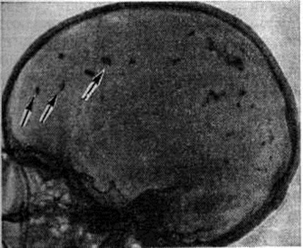 Специфических рентгенологическое признаков при Токсоплазмоз не бывает. Наиболее частым рентгенологическое проявлением Токсоплазмоз являются очаги обызвествления — петрификаты (смотри полный свод знаний) головного мозга, которые обнаруживаются на обзорных рентгенограммах черепа (смотри полный свод знаний: Краниография). Они, как правило, множественные, располагаются чаще в обоих полушариях, размеры их составляют от нескольких миллиметров до 1—1,5 сантиметров. Форма петрификатов округлая или неправильная (рисунок 4). Внутримозговые кальцификаты при Токсоплазмоз следует дифференцировать с очаговыми обызвествлениями другой этиологии, которые наблюдаются как у здоровых лиц (обызвествление шишковидного тела, твёрдой мозговой оболочки, сосудистых сплетений боковых желудочков мозга), так и при различных заболеваниях (туберкулезный менингит, обызвествленные гематомы, цистицеркоз и другие). Поэтому рентгенологическое симптоматика должна учитываться в комплексе с клиническими и серологическими данными. При острой форме Токсоплазмоз возможны поражения органов дыхания, которые выявляются рентгенологически в виде усиления лёгочного рисунка, очаговых и инфильтративных теней, выпота в плевральной полости, увеличения лимфатических, узлов корней легких. Специфического характера эти изменения не имеют. Наиболее часто Токсоплазмоз следует дифференцировать с различными инфекционные болезнями, болезнями крови, лимфогранулематозом (смотри полный свод знаний), коллагеновыми болезнями (смотри полный свод знаний), туберкулёзом (смотри полный свод знаний), арахноидитом (смотри полный свод знаний), энцефалитами (смотри полный свод знаний), олигофрениями (смотри полный свод знаний) иной этиологии, экзогенно-органическими психозами (смотри полный свод знаний: Психические болезни), эпилепсией (смотри полный свод знаний), при поражении глаз — с хориоретинитом (смотри полный свод знаний: Хориоидит). Лечение больных приобретенным Токсоплазмоз проводится в специализированных отделениях в зависимости от преимущественной органной патологии. Применяют этиотропные препараты в сочетании с патогенетической терапией или только патогенетическую терапию. Лица с бессимптомным носительством токсоплазм расцениваются как здоровые, не нуждающиеся в специфическом или другом виде лечения. Этиотропная терапия острого и хронического Токсоплазмоз заключается в применении хлоридина в сочетании с сульфаниламидными препаратами (сульфадимезин, сульфапиридазин, сульфадиметоксин, этазол, норсульфазол) циклами по 5 дней с перерывами между ними 7—10 дней. Обычно проводят 3 цикла, что составляет один курс. Взрослым назначают хлоридин в дозе 0,025 грамм в первые сутки 4 раза, а в последующие дни — 2 раза в сутки; сульфадимезин — в первые сутки по 3—4 грамм в 3—4 приема, в последующие дни — по 2—3 грамм в сутки. Одновременно для предупреждения побочного действия хлоридина показана фолиевая кислота. Противопоказаниями к применению хлоридина и сульфаниламидных препаратов являются заболевания кроветворных органов, почек с нарушением их функций, а также декомпенсация сердечной деятельности. При непереносимости хлоридина назначают аминохинол по 0,15 грамм 2—3 раза в сутки в течение 7 дней. Лечение проводится тремя циклами с перерывами в 10 дней. При непереносим