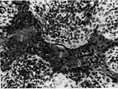По данным Г. Б. Горбуновой (1977), гистаминопексический индекс сыворотки у большинства больных хроническим Тонзиллит не превышает 5% по сравнению с 30—40% в норме. Особенно угнетена гистаминопексия у больных в возрасте от 12 до 16 лет. Патологическая анатомия. Морфологически изменения в небных миндалинах при хронический Тонзиллит отличаются большим разнообразием. Наблюдаются десквамации или ороговение эпителия, выраженная инфильтрация его лимфоцитами и полиморфно-ядерными лейкоцитами, которые мигрируют в лакуны (миндаликовые крипты), где образуются плотные пробки (рисунок 1). При этом формируются папиллярные выросты эпителия лакун (рисунок 2), которые способствуют задержке в них патологический содержимого. В подэпителиальном слое отмечается разрастание соединительной ткани. В паренхиме небной миндалины выявляются очаги размягчения лимфоидной ткани (хронический паренхиматозный Тонзиллит) либо массивные разрастания соединительной ткани (хронический паренхиматозный склеротический Тонзиллит). Наряду с инволюцией лимфатических, фолликулов отмечается их гиперплазия с многочисленными митозами в светлых центрах. В псевдокапсуле (миндаликовая капсула) и паратонзиллярной клетчатке чаще всего встречаются склеротические изменения. Отмечается периваскулярный склероз — мелкие и средние артерии окружены муфтообразными разрастаниями соединительной ткани, бедной клеточными элементами. Лимф, сосуды и капилляры деформированы pi частично облитерированы. Признаки постепенного запустевания обнаруживаются и в венах, при этом ретикулярная ткань вокруг них подвергается гиалинозу (смотри полный свод знаний). Периваскулярная инфильтрация сопровождается в одних сосудах запустеванием просвета, в других — ослаблением мышечного тонуса и повышением проницаемости стенок, что приводит к снижению скорости кровотока и способствует застойным явлениям. Нарушение лимфооттока из миндалин ведёт к застойным и воспалительным изменениям в регионарных лимфатических, узлах.