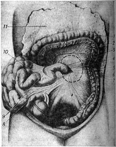Впервые описана Трейтцем в 1857 год По данным Ю. Ю. Крамаренко (1956), больные с Трейтца грыжа составляют около 30% всех больных с внутренними грыжами живота. Среди причин, способствующих возникновению Трейтца грыжа, существенное значение имеют особенности поворота кишечника (смотри полный свод знаний) во внутриутробном периоде и связанные с ними отклонения при формировании кармана Трейтца. Как и другие виды грыж, Трейтца грыжа имеет грыжевые ворота, грыжевой мешок и грыжевое содержимое (смотри полный свод знаний: Грыжи). Карман Трейтца (верхнее дуоденальное углубление) образуется на передней поверхности задней брюшной стенки на уровне II поясничного позвонка слева от него у места перехода двенадцатиперстной кишки в тощую (рисунок). Это углубление ограничено справа двенадцатиперстно-тощим изгибом тонкой кишки, слева и сверху — верхней дуоденальной складкой брюшины, которая идёт от верхушки изгиба к задней брюшной стенке ниже тела поджелудочной железы и содержит в себе нижнюю брыжеечную вену.