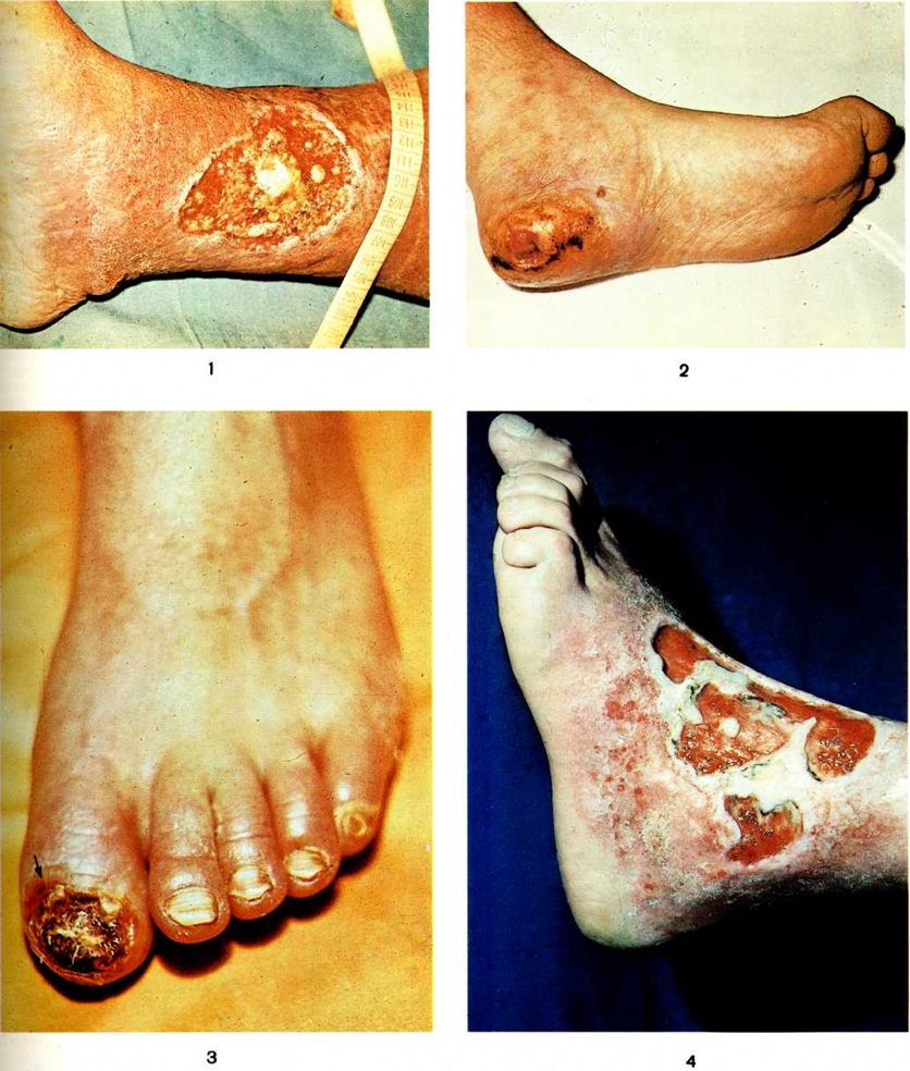 При всем многообразии Трофические язвы морфологический картина их имеет много общих признаков. Дефект кожи и глубже расположенных тканей при Трофические язвы частично заполнен грануляциями, покрытыми детритом, содержащим патогенные микроорганизмы, лейкоциты. Под слоем грануляций располагается плотная фиброзная ткань с очагами воспалительной инфильтрации. В зоне глубоких Трофические язвы голени нередко наблюдаются периостит (смотри полный свод знаний), субпериостальная резорбция и секвестрация кости (смотри полный свод знаний: Секвестр). Иногда на дне Трофические язвы обнаруживаются мышцы, сухожилия, суставы. При микроскопическом исследовании сосудов в зоне Трофические язвы, как правило, выявляют васкулит, для которого характерны фибриноидный некроз, гиалиноз (смотри полный свод знаний). С помощью электронной микроскопии (смотри полный свод знаний) обнаруживают суженные почти вдвое капилляры с утолщенной в 6—7 раз базальной мембраной, наличие в них тромбов. На поверхности и в глубине Трофические язвы развивается патогенная (чаще полиморфная) микрофлора (стафилококк, энтерококк, кишечная палочка, протей, синегнойная палочка, стрептококк, анаэробные бактерии, коринебактерии, грибки, спирохеты Венсана). Для Трофические язвы характерно хроническое, обычно прогрессирующее течение с частыми обострениями, рецидивами и малой склонностью к заживлению. Трофические язвы возникают преимущественно на голени и стопе, в относительно типичных участках для язв той или иной этиологии. Наиболее часто Трофические язвы локализуются: при варикозном расширении вен и посттромбофлебитическом синдроме — на внутренней поверхности нижней трети голени (цветной рисунок 1); облитерирующих заболеваниях артерий — на пальцах стопы; врождённых сосудистых изменениях — на голени, стопе и кисти; гипертонической болезни — на передней или наружной поверхности голени; заболеваниях и травмах спинного мозга и периферических нервов — на подошвенной поверхности стопы и в пяточной области (цветной рисунок 2); сахарном диабете — на подошвенной поверхности стопы и I пальце стопы (цветной рисунок 3). Трофические язвы на почве коллагеновых болезней чаще располагаются на голенях (симметрично), при пролежнях — в области крестца и пяток. Трофические язвы при ожогах нередко бывают множественными, неправильной формы (цветной рисунок 4). Трофические язвы имеет округлую, овальную или неправильную форму, размеры её могут достигать 200 см² и более; иногда язва циркулярно охватывает голень. Края Трофические язвы обычно отечны, уплотнены, при прогрессировании язвы чаще подрытые. Кожа вокруг Трофические язвы приобретает бурую или цианотичную окраску, инфильтрирована, плотна. При так называемый нейропатической диабетической язве стопы (смотри полный свод знаний: Стопа диабетическая) температура кожи поражённой конечности повышена. Дно Трофические язвы обычно покрыто грануляциями с умеренным гнойным отделяемым, отсутствие которого (при так называемый сухой язве) говорит об ареактивности тканей. Зеленоватая окраска гноя является признаком наличия в язве синегнойной палочки (смотри полный свод знаний). Ихорозное и геморрагическое отделяемое свидетельствует о неблагоприятном течении язвенного процесса. Внезапное увеличение отделяемого, неприятный запах наб
