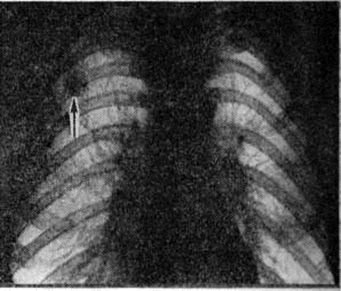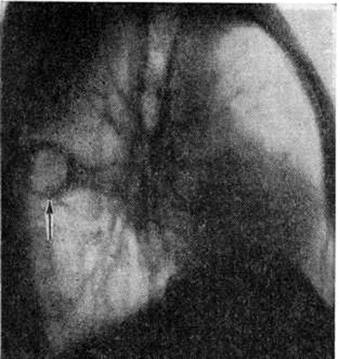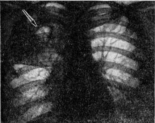 При рентгенологическое исследовании туберкулемы лёгких выявляются в виде фокусов округлой формы. Туберкулемы диаметром 1,5—2 сантиметров относят к мелким. Чаще выявляются туберкулемы средних размеров — диаметром 2—4 сантиметров крупные туберкулемы — более 4 сантиметров в диаметре занимают объём одного-двух сегментов лёгкого. Интенсивность их тени значительная, структура чаще неоднородная за счёт фиброза, уплотнённых масс казеозного некроза, включений кальцинатов, участков распада. Очертания обычно чёткие, неровные (фестончатые). На уровне туберкулем определяются плевропульмональные рубцы, очаги в окружающей лёгочной ткани, выраженная тяжистость по ходу бронхо-сосудистого пучка. При прогрессировании процесса туберкулемы приобретают эллипсоидную форму, нечёткие очертания, в них выявляются одиночные и множественные полости распада, неправильной (полулунной, щелевидной) формы, располагающиеся близ устья дренирующего бронха особенно по ходу бронхо-сосудистого пучка (рисунок 11). У больных с туберкулемой лёгкого в 70—80% случаев отмечается положительная проба Манту (смотри полный свод знаний: Туберкулинодиагностика). Причём в отличие от других форм вторичного туберкулёза при туберкулёме лёгкого чаще наблюдается гиперергическая реакция на туберкулин. При впервые диагностированной туберкулёме лёгкого выявить активность процесса в ряде случаев помогают определение белковых фракций крови до и после введения туберкулина, показатель повреждаемости нейтрофилов, реакция торможения миграции лейкоцитов (смотри полный свод знаний: Лейкоцитарные тесты), а также бластотрансформация лимфоцитов (смотри полный свод знаний). Большое значение имеет бронхологическое исследование. При бронхоскопии у 1,2—3,3% больных туберкулемой лёгкого удаётся обнаружить туберкулёз устьев сегментарных, реже — долевых бронхов; при бронхографии выявляется симптом ампутации мелких бронхов вблизи капсулы, их деформация, нередко мелкие бронхоэктазы. Производится также гистологический исследование материала, полученного с помощью биопсии. Дифференциальный диагноз проводят с круглым туберкулёзным инфильтратом, имеющим сходную с туберкулемой рентгенологическое картину, с другими шаровидными образованиями в лёгких, реже — с грибковыми поражениями (смотри полный свод знаний: Пневмомикозы), паразитарными заболеваниями (смотри полный свод знаний: Легкие, паразитарные заболевания), осумкованным плевритом (смотри полный свод знаний) и другие Инфильтративный туберкулёз отличается более острым началом с признаками интоксикации и изменениями крови, более выраженной динамикой рентгенологическое картины, склонностью к деструкции, а также положительной динамикой процесса (через 1,5—2 месяцев после начала лечения противотуберкулёзными средствами). Большие трудности возникают при дифференциальной диагностике бессимптомно протекающей туберкулемы с шаровидными образованиями лёгких другой этиологии — с бессимптомно протекающим периферическим раком лёгкого, заполненной ретенционной бронхиальной кистой, а также с доброкачественными опухолями, локализующимися в 1-м, 2-м и 6-м лёгочных сегментах, особенно у лиц, перенёсших в прошлом туберкулёз, у которых имеются остаточные изменения в виде кальцинированных очагов в лёгких и лимфатических, узлах к