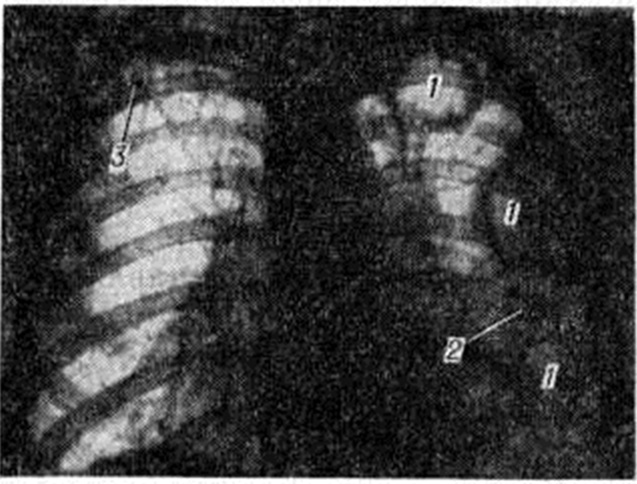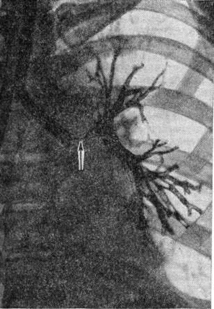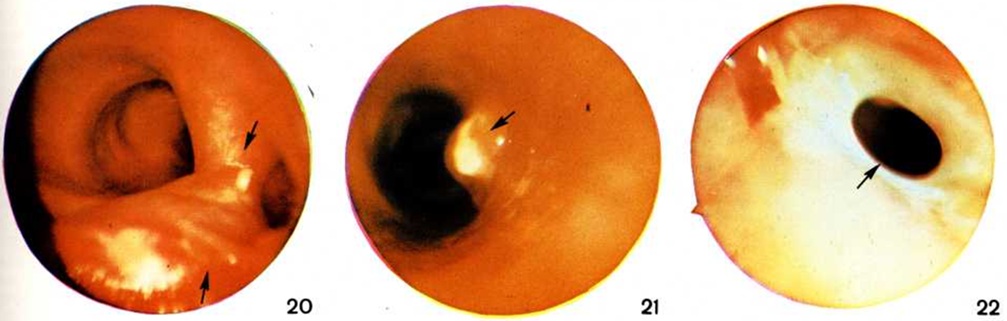 Л. К. Богуш с соавторами (1967) различают концентрический рубцовый стеноз (рисунок 16), пристеночный стеноз с поражением одной стенки бронха и стеноз бронха вследствие полной атрофии стенок (так называемый атрофичный бронх). Иногда, при реактивации туберкулёза внутригрудных лимфатических, узлов, в просвете крупного (главного или долевого) и более мелкого (сегментарного или субсегментарного) бронха образуется бронхолит, представляющий собой секвестр кальцинированной части лимфатических, узла или кальцинированные казеозные массы, проникшие в бронх через бронхиальный свищ. Различают эндобронхиальный бронхолит, при котором кальцинат находится полностью в просвете бронха, трансмуральный бронхолит, характеризующийся частичным выходом кальцината в просвет бронха, и интрамуральный бронхолит, при котором кальцинат находится в толще стенки бронха. Клинические, картина при образовании бронхолита характеризуется разнообразной симптоматикой и может напоминать бронхит, пневмонию, опухоль и другие (смотри полный свод знаний: Бронхолитиаз). Диагноз туберкулёза трахеи и бронхов устанавливают при бронхоскопии (смотри полный свод знаний) с биопсией и бактериологические исследованием полученного материала. При рентгенологическое исследовании следует учитывать прямые и косвенные признаки поражения. Прямыми признаками поражения трахеи, главных и долевых бронхов являются их деформация и сужение вплоть до полного закрытия просветов, локальные утолщения стенок; в области прилегания к стенке бронхов уплотнённых лимфатических, узлов, иногда с кальцинатами, отмечается выбухание стенок бронхов. К косвенным признакам относятся различные вентиляционные нарушения: ателектаз, гиповентиляция, различные по объёму участки эмфиземы. Дифференциальный диагноз проводят прежде всего с острым и хронический неспецифическим эндобронхитом. Основным критерием при этом служит распространённость поражения слизистой оболочки: ограниченное— при туберкулёзе и диффузное, двустороннее,— при неспецифическом процессе. Туберкулёз бронхов дифференцируют с доброкачественными опухолями (смотри полный свод знаний: Бронхи), бронхогенным раком, исходящим из эпителия крупных бронхов в начальной стадии его развития, с саркоидозом (смотри полный свод знаний) органов дыхания, который, по данным ряда исследователей, в 12% случаев сопровождается появлением в слизистой оболочке крупных бронхов пролиферативных изменений в виде бляшек и бугорков, сходных с туберкулёзными, а в ряде случаев — с лимфогранулематозом (смотри полный свод знаний), сифилисом (смотри полный свод знаний), ксантоматозом (смотри полный свод знаний). Лечение туберкулёза трахеи и бронхов комплексное с учётом переносимости больным лекарственных препаратов, а также устойчивости к ним микобактерий туберкулёза. Специфическое поражение трахеи и бронхов свидетельствует об осложнённом течении лёгочного процесса. Поэтому возникает необходимость усиления терапевтического воздействия на организм в целом. При этом сроки лечения удлиняются в зависимости от формы основного процесса. Используют комбинации различных противотуберкулёзных средств (не менее 3—4) в сочетании с патогенетическими. Один из препаратов вводят эндобронхиально шприцем или в виде аэрозоля с учётом индивидуальной переносим