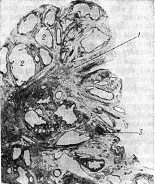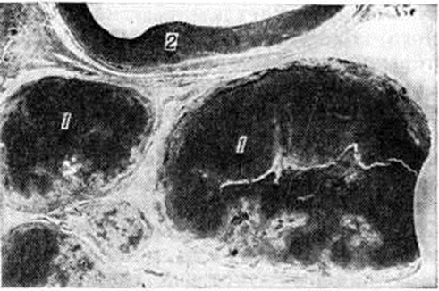 Развитие заболевания у детей связано с первичным инфицированием, чаще аэрогенным путём, а также в результате проникновения микобактерий туберкулёза через нёбные миндалины и слизистую оболочку полости рта. У взрослых заболевание чаще развивается вследствие реактивации ранее перенесённого процесса во внутригрудных лимфатических, узлах. В этом случае бронхаденит (смотри полный свод знаний) осложняется развитием бронхожелезистого свища и распространением процесса на лёгочную ткань. Эта форма известна как железисто-бронхогенная, железисто-бронхолёгочная форма туберкулёза или аденогенный, бронхолёгочный туберкулёз. Поражаются преимущественно бронхолёгочные лимфатических, узлы средней доли правого лёгкого, язычкового сегмента и верхних долей лёгких. При этом в лимфатических, узлах формируются очаги казеозного некроза, занимающие иногда всю ткань лимфатических, узла (рисунок 3). При прогрессировании процесса специфические изменения переходят на окружающие ткани, вовлекая в процесс стенку бронха, нередко с образованием свища. Процессы заживления протекают с частичным рассасыванием и рубцеванием туберкулёзных очагов. Клинические, картина туберкулёза внутригрудных лимфатических, узлов многообразна и зависит от генеза заболевания, выраженности морфологический изменений и их локализации. Развитие бронхаденита, как правило, сопровождается повышением чувствительности к туберкулину (смотри полный свод знаний), нередко развитием узловатой эритемы (смотри полный свод знаний: Эритема узловатая), фликтенулёзного кератоконъюнктивита (смотри полный свод знаний: Конъюнктивит), скрофулодермы (смотри полный свод знаний: Туберкулёз внелёгочный, туберкулёз кожи и подкожной клетчатки), экссудативного плеврита (смотри полный свод знаний). Отмечается повышение температуры тела, недомогание, появление ночных потов, ухудшение аппетита, потеря в весе, сухой кашель. Малая форма бронхаденита, как правило, протекает скрыто, иногда с подъёмом температуры, лёгким недомоганием, что требует особенно тщательного обследования. В зависимости от реактивности организма больного (смотри полный свод знаний: Реактивность организма) и его иммунологический статуса течение туберкулёза внутренних лимфатических, узлов может быть различным. При благоприятном течении вслед за острой вспышкой наступает снижение температуры до субфебрильных цифр и уменьшаются явления интоксикации. Одновременно происходит рассасывание воспаления вокруг увеличенных лимфатических, узлов и уменьшение их размеров. Повышенная чувствительность к туберкулину может сохраняться в течение нескольких лет. Динамика рентгенологическое изменений длительна, уменьшение размеров лимфатических, узлов сопровождается отложением в них (преимущественно в их периферических отделах) крошковидных, а затем более крупных кальцинированных включений. Осложнённое течение туберкулёза внутригрудных лимфатических, узлов отличается большей длительностью и менее благоприятным исходом. Несмотря на рассасывание перифокального воспаления вокруг лимфатических, узлов, процесс в них не затихает, и микобактерии туберкулёза контактным или лимфогенным путём распространяются на другие группы лимфатических, узлов и на другие органы. Наиболее частым осложнением туберкулёзного бронхаден
