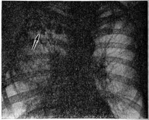 Диагноз инфильтративного туберкулёза лёгких ставят на основании результатов рентгенологическое обследования, при котором определяются ограниченные инфильтративные, а также разлитые, часто обширные процессы (сегментарные или долевые) в зависимости от клинико-рентгенологическое варианта заболевания. Инфильтраты на рентгенограммах обычно представлены изолированными фокусами округлой формы, захватывающими группу долек, часть сегмента, реже сегмент лёгкого. Они комбинируются с очагами и фиброзными изменениями. Тень инфильтрата имеет слабую или среднюю интенсивность (рисунок 8), иногда в ней определяются очаговые уплотнения. Очертания инфильтрата отчётливые, но не такие резкие, как, например, контуры туберкулемы. Округлые инфильтраты склонны к рассасыванию и уплотнению. В части случаев при прогрессирующем течении выявляются нечёткость их очертаний, наличие отводящей дорожки к корню лёгкого, полости распада и свежие очаги. Разлитые, обширные инфильтраты чаще имеют неправильную треугольную форму. Очертания их обычно нечёткие и неровные, интенсивность тени средняя; при выраженном казеозном некрозе, ателектазе поражённого участка или значительных размерах инфильтрата тень весьма интенсивна. Структура этих инфильтратов часто неоднородна за счёт наличия более плотных очагов и полостей распада (рисунок 9, 10); обычно выражены тяжистые тени, свидетельствующие о перибронхиально-периваскулярных изменениях. Казеозная пневмония рентгенологически проявляется образованием множественных бронхолобулярных фокусов или уплотнений, захватывающих долю или два сегмента лёгкого, полостей распада и множественных очагов бронхогенной диссеминации. В диагностике инфильтративного туберкулёза лёгких важную роль играет бактериологические исследование. У 96—97% больных инфильтративным туберкулёзом с формирующейся или сформировавшейся полостью удаётся обнаружить микобактерии туберкулёза в мокроте. Труднее найти микобактерии у больного, принимавшего уже противотуберкулёзные средства или пенициллин в комбинации со стрептомицином. Поэтому при выявлении инфильтративных изменений в лёгких обязательно нужно провести тщательное исследование мокроты до начала лечения. При отсутствии мокроты необходимо применить провоцирующие кашель аэрозоли. Если полость видна только на томограмме, если она только формируется или у больного отмечается фаза распада, обычное микроскопическое исследование позволяет обнаружить микобактерии туберкулёза примерно у 1/3 больных, у остальных 2/я больных микобактерии можно обнаружить методом посева. При наличии пневмонической тени в лёгком и выявлении бактериовыделения диагноз инфильтративного туберкулёза является обоснованным. Однако не следует переоценивать роль бактериовыделения при постановке диагноза инфильтративного туберкулёза, так как у больных пневмонией с сопутствующим туберкулёзом на почве реактивации старых очагов также может наблюдаться однократное или повторное бактериовыделение. Диагноз инфильтративного туберкулёза может быть поставлен лишь на основании комплекса признаков, одним из которых является обнаружение микобактерий.