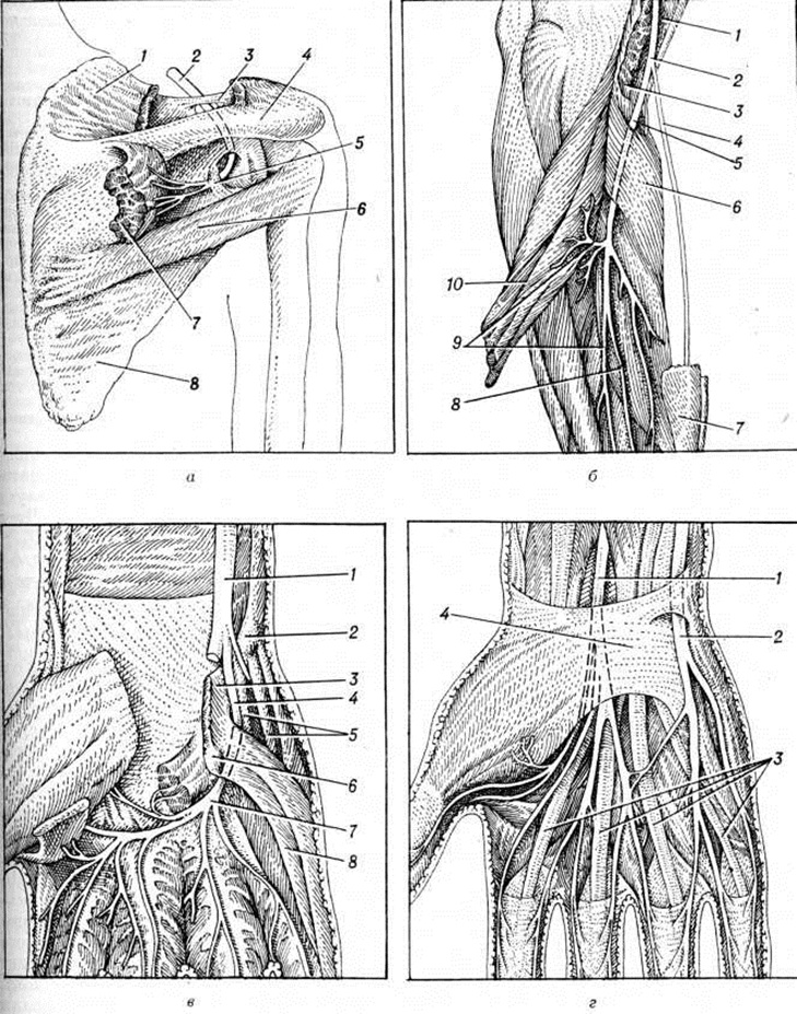 Рис Схематическое изображение механизмов развития некоторых туннельных синдромов (пунктирной линией обозначен сдавливаемый участок нерва): а — сдавление надлопаточного нерва в вырезке лопатки под верхней поперечной связкой лопатки: 1 — надостная мышца (рассечена), 2 — надлопаточный нерв, 3 — верхняя поперечная связка над вырезкой лопатки, 4 — ость лопатки, 5 — нижняя поперечная связка лопатки, 6 — малая круглая мышца, 7 — подостная мышца (отсечена и отвёрнута), 8 — лопатка; б — сдавление глубокой ветви лучевого нерва, прободающей супинатор, и заднего межкостного нерва под коротким лучевым разгибателем запястья: 1 — плечевая мышца, 2 — лучевой нерв, з — плечелучевая мышца (отрезана), 4 — поверхностная ветвь лучевого нерва, 5 — глубокая ветвь лучевого нерва, 6 — супинатор, 7 — короткий лучевой разгибатель запястья (отсечён), 8 — задний межкостный нерв, 9 — мышечные ветви заднего межкостного нерва, 10 — разгибатель пальцев (отсечён и отвернут); в — сдавление глубокой ветви локтевого нерва на ладонной поверхности кисти: 1 — локтевой нерв, 2 — гороховидная кость, 3 — удерживатель сгибателей запястья (рассечён), 4 и 7 — глубокая ветвь локтевого нерва, 5 — гороховидно-пястная связка, 6 — крючок крючковидной кости, 8 — мышца, противопоставляющая мизинец; грамм — сдавление срединного нерва в запястном канале под удерживателем сгибателей: 1 — срединный нерв, 2 — локтевой нерв, 3 — сухожилия сгибателей пальцев, 4 — удерживатель сгибателей.