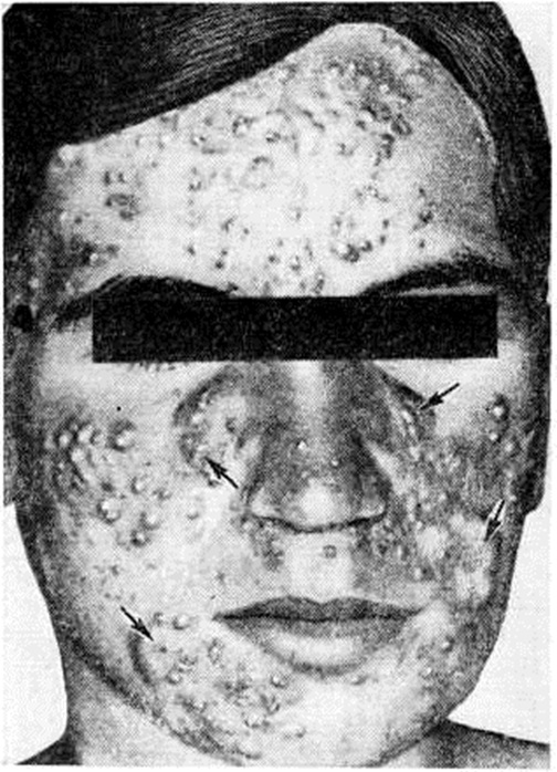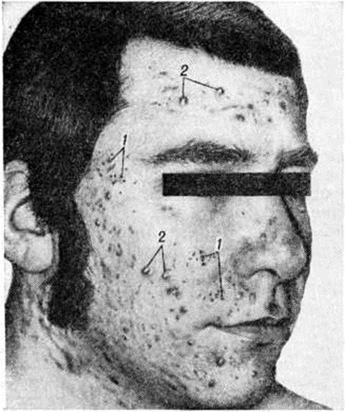 Лечение проводят антибиотиками, лидазой; используют иммунотерапию (аутогемотерапию, стафилококковую вакцину и другие), диатермокоагуляцию отдельных элементов; в ряде случаев рекомендуют рентгенотерапию (смотри полный свод знаний). Наружно назначают дезинфицирующие средства в виде спиртовых растворов, взвесей и мазей. Красные угри поражают кожу лица, чаще у женщин в возрасте 30 лет и старше. Заболевание развивается на фоне нервно-вегетативной и сосудистой лабильности, а также желудочно-кишечные и эндокринных расстройств. Возможной причиной развития воспалительного процесса считают золотистый и белый стафилококк или железницу угревую, паразитирующую в волосяных фолликулах и сальных железах. Для заболевания характерно хронический течение; обострения наблюдаются при эмоциональном напряжении т нарушении диеты, перегревании и переохлаждении, солнечных облучениях, при несоблюдении правил личной гигиены. Для клинические, картины характерны застойная гиперемия кожи лба, щёк и подбородка, воспалительные ярко-розовые или синюшно-красные папулопустулы величиной до 5—7 миллиметров, постепенное развитие на этих участках телеангиэктазий (смотри полный свод знаний). Салоотделение на поражённых участках повышено. Заболеванию может сопутствовать кератит (смотри полный свод знаний). Дифференциальную диагностику проводят с розацеоподобным туберкулёзом кожи (смотри полный свод знаний: Туберкулёз внелёгочный) и периоральным дерматитом, локализующимся вокруг рта и характеризующимся полиморфной сыпью, диффузной эритемой и умеренным зудом. При гистологический исследовании выявляют резкое расширение кровеносных сосудов в верхних отделах дермы, вокруг волосяных фолликулов и сальных желёз, образование инфильтрата, состоящего из лимфоидно-гистиоцитарных элементов и нейтрофилов, иногда с гигантскими клетками, а также абсцедирование и перифокальный фиброз. При красных Угри назначают тетрациклин по 0,2—0,3 грамм 4 раза в сутки, метронидазол по 0,25 грамм 2 раза в сутки (в течение 4 недель). Рекомендуются также никотиновая кислота по 0,05 грамм 3 раза в день, препараты хинолинового ряда (делагил) по 0,25 грамм 2 раза в сутки. Наружно применяют взбалтываемые взвеси с ихтиолом или серой, 5—10% синтомициновую эмульсию, гелиомициновую или эритромициновую мази, обтирания простерилизованным растительным маслом. Возможно лечение по методу М. П. Демьяновича: последовательное втирание в очаги поражения 60% раствора тиосульфата натрия и 6% раствора соляной кислоты. На расширенные сосуды и отдельные папулопустулы рекомендуется диатермокоагуляция. Применяют криомассаж (смотри полный свод знаний: Криохирургия). Рекомендуется диета с исключением сладких и острых блюд, алкоголя. Некротические угри (синонимы угри оспенновидные) — редкое заболевание, наблюдающееся у женщин и мужчин зрелого возраста. Причины его не установлены; предполагается связь со стафилококковой инфекцией (смотри полный свод знаний) и нарушениями обмена веществ. Клинические картина характеризуется высыпанием розовых или багрово-красных перифолликулярных узелков, в центре которых образуется похожий на пустулу очаг некроза, постепенно подсыхающий в кровянисто-чёрную корку. После отпадения корки остаётся углублённый оспенноподобный рубец. Узелки локализуются обычно на коже лба 