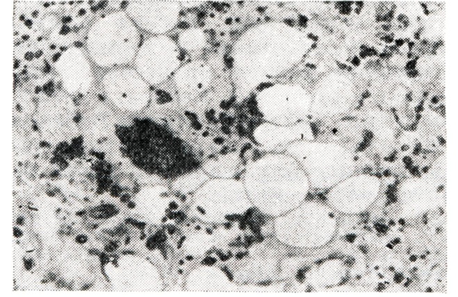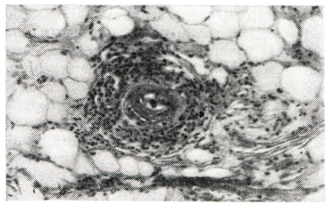 При другом варианте Вегенера Гранулематоз отмечается генерализация сосудистых и гранулематозных изменений с поражением внутренних органов, кожи, костно-суставного аппарата, мышц, нервной системы. Смерть наступает чаще при явлениях почечной или лёгочной недостаточности. На аутопсии в почках обнаруживаются свежие и рубцующиеся ишемические инфаркты, постинфарктные рубцы, явления нефрита, признаки атрофии коры, зернистость её поверхности. В лёгких находят различной величины некротические очаги, пневмонические фокусы, полости распада, абсцессы, геморрагические инфаркты, поля пневмосклероза; со стороны сердца — явления кардиосклероза. В слизистой оболочке желудка и кишечника выявляются геморрагии, очаговые некрозы, язвенные дефекты. Микроскопически в различных органах и тканях находят деструктивные, деструктивно-продуктивные (рисунок 2) и продуктивные эндо-, мезо-, пери- и панваскулиты (артерииты, артериолиты, реже флебиты и капилляриты), а также полиморфноклеточные гранулёмы. В почках они обычно располагаются вокруг поражённых клубочков в виде так наз. гранулематозного перигломерулита.