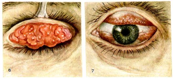 Клиническая картина. В типичных случаях поражается конъюнктива хряща век — пальпебральная (тарзальная) форма или конъюнктива глазного яблока вокруг лимба — бульбарная (лимбальная) форма; обе формы могут существовать и одновременно — смешанная форма Весенний катар (цветной рисунок 7); остальные участки конъюнктивы в процесс не вовлекаются.