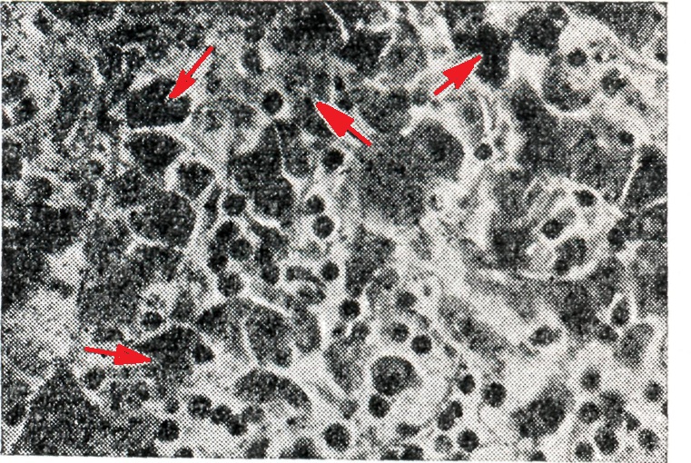 При Ветряная оспа поражаются кожные покровы, слизистые оболочки, внутренние органы и головной мозг. Образование ветряночных пузырьков в коже начинается с вакуолизации и дискомплексации шиповидного слоя эпидермиса. Постепенно эпителиальные клетки подвергаются баллонной дистрофии до полной гибели. Характерным является наличие внутриядерных и внутрицитоплазматических эозинофильных включений в изменённых клетках эпидермиса. В шиловидном слое наблюдается гиперплазия, приводящая к образованию многоядерных синцитиальных клеточных форм. Последнее особенно выражено при формировании крупных пузырьков. Некрозы клеток эпидермиса и накопление межтканевой жидкости ведут к образованию внутриэпидермальных пузырьков. Дерма отёчна, в некоторых случаях в ней наблюдаются кровоизлияния и небольшое увеличение моноцитарных клеток в периваскулярной ткани. Инволюция пузырьков происходит путём резорбции жидкости с образованием сухой корочки. Различные стадии развития и размеры пузырьков обусловливают полиморфизм сыпи, характерный для Ветряная оспа (цветной, рисунок 1—3). При тяжёлой форме Ветряная оспа наблюдается образование очень крупных пузырьков, как бы застывших на одной стадии развития. Образование эрозий и язвочек на видимых слизистых оболочках наблюдается и при Ветряная оспа без летального исхода. В случаях Ветряная оспа с летальным исходом эрозии и язвочки описаны на слизистых оболочках пищеварительного тракта, трахеи, почечных лоханок, мочевого пузыря, уретры, шейки матки. Макроскопически отмечается округлость формы, наличие геморрагического пояса, размеры, соответствующие элементам кожных высыпаний. Микроскопически — значительный отёк подслизистого слоя, кровоизлияния и в неосложнённых случаях отсутствие воспалительной инфильтрации. На конъюнктиве глаза и слизистой оболочке уретры можно наблюдать образование везикул, предшествующих эрозиям, с баллонной дистрофией эпителия. Из внутренних органов чаще поражаются печень, почки, лёгкие; реже — селезёнка, костный мозг, кора надпочечников, поджелудочная железа, тимус.