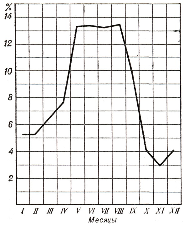ЭтиологияВозбудитель Везикулёзный риккетсиоз у экспериментально заражённых животных при окраске по Романовскому — Гимзе или Маккиавелло обнаруживается в цитоплазме мезотелиальных клеток и частично внеклеточно. Возбудитель в мазках из органов лабораторных животных имеет вид овоидов, кокков (часто диплококков), мелких палочек или более крупных бациллярных и нитевидных форм. В препаратах из желточного мешка куриных эмбрионов нередко встречаются короткие цепочки из 5—6 риккетсий. По морфологическим и тинкториальным свойствам D. murinus не отличается от возбудителей клещевого риккетсиоза Северной Азии и марсельской лихорадки, но при обильном размножении, напр. в лёгких белых мышей, образует очень мелкие палочковидные формы, сходные с риккетсиями сыпнотифозной группы. D. murinus хорошо размножается в желточном мешке куриных эмбрионов 6—7-дневного возраста, вызывая их гибель на 4—5-й день при скудном накоплении риккетсий. Более обильное размножение наблюдается в переживающей эмбриональной ткани на сывороточном агаре Тирода и в других тканевых культурах. По антигенной структуре D. murinus близок к риккетсиям марсельской лихорадки и клещевого сыпного тифа Северной Азии. Антигенного родства с риккетсиями Провацека, Музера, Бернета и цуцугамуши не наблюдается. Смотри также Риккетсии. ЭпидемиологияЗаболеваемость Везикулёзный риккетсиоз характеризуется весенне-летней сезонностью, хотя случаи Везикулёзный риккетсиоз выявляются в течение всего года: увеличение её начинается в марте — апреле, достигает максимума в мае, сохраняясь на этом уровне в июне — августе, затем быстро снижается (рисунок 1). Сезонность заболеваемости Везикулёзный риккетсиоз связана с биологией клеща-переносчика. Максимальный подъем заболеваемости совпадает с периодом наибольшей активности клеща.