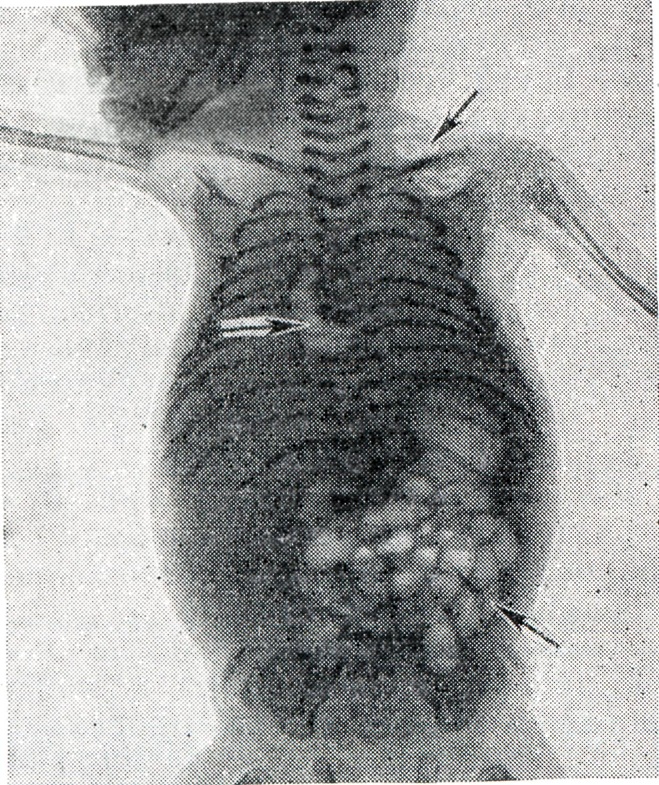 Выявление газа в полостях сердца плода всегда затруднительно из-за наличия газов в кишечнике матери, но газ без труда обнаруживается при рентгенографии мертворождённого. Присутствие газовых скоплений в сердце и крупных сосудах объясняют посмертным внеутробным гниением в том случае, если уже имеются значительно выраженные наружные признаки трупного разложения, когда газы скапливаются и в подкожной клетчатке (рисунок 2).