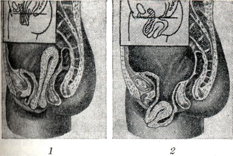 Считая недостаточность тазового дна основной причиной Выпадение матки, влагалища, ряд авторов придаёт большое значение устойчивости соединительной ткани и особенно отклонению матки кзади. Мартин (А. Е. Martin) и Э. Бумм на основании анатомических и клинических данных, отмечая значение мышечного аппарата тазового дна и роль внутрибрюшного давления в происхождении опущения и Выпадение матки, влагалища, основной причиной этого заболевания считают недостаточность соединительнотканных образований. Не меньшую роль следует отводить и функциональному состоянию тканей, конституциональным особенностям (астения), при которых ткани обладают пониженным тонусом и легко подвергаются перерастяжению. При этом у женщин, страдающих выпадением матки, часто наблюдается смещение и других органов брюшной полости (гастроэнтероптоз, блуждающая почка, грыжи). Ослабление тканей таза может возникать также на почве расстроенной иннервации при spina bifida occulta у девушек и у нерожавших женщин. Клиническая картинаВыпадение матки, влагалища в подавляющем большинстве случаев развивается медленно, характеризуется затяжным течением и неуклонно прогрессирует. В редких случаях отмечается остро наступающее выпадение матки — при резком натуживании, падении с высоты на ноги и тому подобное. При остро наступившем выпадении матки отмечаются сильные боли с явлениями шока (слабость, обморок, головокружение, рвота). Изменения со стороны половых органов при Выпадение матки, влагалища различны. При незначительных степенях опущения половая щель зияет, при натуживании выпячиваются стенки влагалища, больше и чаще — передняя стенка. Когда матка значительно смещена, при натуживании обычно прежде всего выпячивается передняя стенка, затем из половой щели показывается шейка матки и, наконец, задняя стенка влагалища. При выраженном ректоцеле соотношения могут быть обратными. При полном выпадении из половой щели выходят гипертрофированная шейка матки и стенки влагалища. Шейка отёчна, цианотична; наружное отверстие нередко зияет. На шейке часто имеются изъязвления. При зна¬чительном удлинении шейки возможна задержка выделений из полости матки, что может привести к образованию пиометры. При полных выпадениях изменяется характер слизистой оболочки влагалища, складки её исчезают, она становится сухой и эпидермизируется. На почве давления и травматизации образуются изъязвления, которые инфицируются и превращаются в глубокие язвы. В матке отмечаются застойные явления; полость её значительно увеличена (до 18—20 сантиметров) главным образом за счёт удлинённой шейки. Болезненные проявления не всегда зависят от степени выпадения. У нервных женщин часто незначительное смещение матки вниз вызывает чувство давления, тянущие боли в паху, пояснице; в других случаях, даже при значительно выраженном выпадении, боли совершенно не беспокоят женщину. Нередко боли в пояснице, внизу живота появляются после тяжёлой работы, уменьшаясь и даже исчезая совсем в сидячем или лежачем положении. Часто отмечаются бели, кровянистые выделения. Рано выявляются симптомы со стороны мочевого пузыря — частые позывы, затруднённое мочеиспускание. При значительно выраженном цистоцеле больные часто вынуждены перед мочеиспусканием вправлять выпавшую матку. При значительно выраженном ректоцеле 