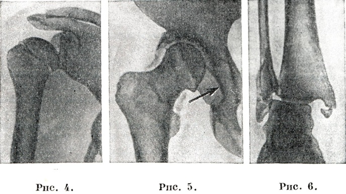 Кроме случаев полного Вывихи, рентгенологическое исследование выявляет также и отклонения от нормального состояния суставов при меньших степенях смещения костей (подвывихи в истинных суставах и растяжения связочного аппарата в полусуставах, то есть в синхондрозах и синдесмозах). Методикой исследования является обычная рентгенография. Рентгенологическое симптоматика Вывихи наглядна даже в одной проекции исследования по признаку несоответствия положения суставных поверхностей в повреждённом суставе. В сомнительных случаях необходимо сравнительное исследование одноименного сустава другой конечности в одинаковых проекционных условиях. При рентгенодиагностике, кроме факта Вывихи и его характера, учитывается также направление и степень смещения вывихнутой кости. При травматических Вывихи всегда нужно помнить также о возможности сопутствующего перелома или отрыва кусочка костного вещества. Только рентгенологически удаётся дифференцировать Вывихи от переломовывиха и от некоторых внутрисуставных переломов (например, анатомической шейки плечевой кости). Основными рентгенологическими признаками при неполном Вывихи являются расширение суставной щели (рисунок 4) и пространственное несоответствие суставных поверхностей костей повреждённого сустава (рисунок 5 и 6), в частности так называемый штыковидная деформация продольной оси конечности, например в коленном суставе. Неправильная укладка исследуемого и изображение сустава, например плечевого, в атипической проекции могут создать ложное впечатление подвывиха, которого в действительности нет. Особенно важно точное распознавание всех видов Вывихи и подвывихов в шейном отделе позвоночника (рисунок 7), в связи с которыми могут возникать клинические показания к немедленному оперативному вмешательству. ЛечениеДоврачебная помощь при В. должна обеспечить только полный покой повреждённой конечности путём наложения транспортной шины (смотри) или фиксирующей повязки. В стационаре лечение Вывихи включает вправление (repositio), кратковременную фиксацию и последующую функциональную терапию. Устранение Вывихи является неотложным мероприятием, легче производится и даёт наилучшие результаты при свежих Вывихи, особенно немедленно после травмы. В несвежих случаях закрытое вправление оказывается успешным примерно в 40% случаев. При застарелых Вывихи оно вообще неосуществимо — приходится производить открытое вправление, а иногда и резекцию сустава.