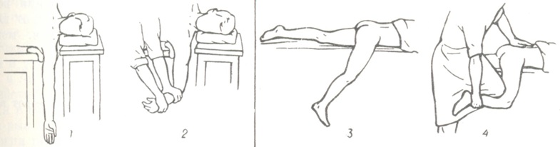 В основе всех действий по вправлению Вывихи лежит достижение надёжного расслабления мускулатуры повреждённой конечности: вторичная мышечная ретракция, наступающая вслед за Вывихи, прочно удерживает вывихнутую головку в порочном положении, препятствуя устранению Вывихи. Умение вправить Вывихи — это прежде всего умение надёжно расслабить мускулатуру. Грубые приёмы вправления, рассчитанные на насильственное преодоление ретракции, не должны иметь место, так как они сопряжены со значительной травматизацией окружающих тканей и нередко приводят к дополнительным повреждениям суставной капсулы, суставных концов костей, сосудов и нервов. Расслабления мускулатуры можно достигнуть различными способами. При Вывихи в мелких суставах — фаланг пальцев, предплечья, стопы, а также плеча у лиц со слабо выраженной мускулатурой — хорошая релаксация обеспечивается местной анестезией 2% раствором новокаина, вводимым в полость повреждённого сустава. В зависимости от локализации необходимо введение 5—20 миллилитров новокаина. В ряде случаев расслабление мускулатуры достигается за счёт придания конечности особого положения, как это имеет место, например, при вправлении Вывихи плеча и бедра по способу Джанелидзе (рисунок 8). При несвежих Вывихи, а также при попытках повторного вправления В. в крупных суставах все манипуляции должны производиться под наркозом, обеспечивающим полную релаксацию и, следовательно, наилучшие условия для вправления. Предложено множество способов устранения Вывихи различной локализации (способы Кохера, Лексера, Джанелидзе, Боброва и другие). При хорошей анестезии и релаксации выбор способа вправления Вывихи не имеет существенного значения. Момент установления вывихнутой головки соответственно суставной впадине определяется по характерным признакам — щелчку и восстановлению полной амплитуды движений в пострадавшем суставе. В некоторых случаях, несмотря на полную релаксацию мускулатуры, устранить Вывихи не удаётся из-за различного рода механических препятствий (ущемление сухожилий или связок, части суставной капсулы). Эти невправимые Вывихи подлежат оперативному лечению. После вправления Вывихи конечность устанавливают в полусогнутом в суставе положении, которое является наиболее благоприятным для заживления в случае разрыва капсулы. В остром периоде заживления разрывов капсулы и связок конечность нуждается в иммобилизации (смотри). Она может быть осуществлена различными способами. Наиболее частой формой иммобилизации является лонгетная гипсовая повязка, но в некоторых случаях допустимы и иные способы: мягкая повязка Дезо при Вывихи плеча, при Вывихи бедра скелетное вытяжение (смотри). Длительность иммобилизации после травматического Вывихи плеча — около 3 недель, при Вывихи бедра — до 4 недель. В. ключицы, голени, стопы нуждаются в более длительной иммобилизации (1 — 1½ месяцев). Большое значение в лечении Вывихи принадлежит функциональной терапии, длительность которой определяется анатомо-физиологический особенностями сустава, видом травмы, возрастом больного и его профессией. Функциональное лечение включает лечебную гимнастику, массаж, физиотерапию. Все лечебные мероприятия должны проводиться под рентгенологическим контролем. Осложнения: контрактуры, деформирующий артроз, асептич