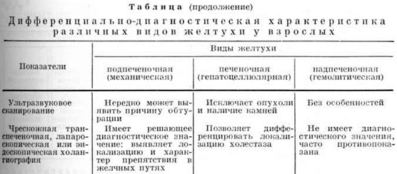 Печёночная желтуха (паренхиматозная)Происхождение этого вида Желтуха связано с инфекционным (вирусный гепатит) и токсическим поражением печени (отравления химический веществами, непереносимость лекарств и так далее). Печёночная Желтуха наблюдается также при циррозах печени, некоторых паразитарных заболеваниях, острых и хронический инфекциях и другие К печёночным Желтуха относят также некоторые особые формы поражения печени, например, холангиолитические (холестатические) гепатиты. Разнообразные расстройства образования и выделения билирубина обусловлены возникновением сообщений между желчными путями, кровеносными и лимф, сосудами, повреждением стенки мелких желчных ходов и образованием тромбов, создающих внутрипечёночные препятствия прохождению желчи, чему способствует также воспалительный отёк перипортальных пространств. При печёночной Желтуха (цветной таблица, ст. 176, рисунок 2) желтушность лимонного или красноватого оттенка; в сыворотке крови повышается содержание связанного билирубина до 20 миллиграмм% и выше. В моче появляется билирубин и желчные кислоты ещё до видимой Желтуха, а затем их количество нарастает. Полное обесцвечивание кала наблюдается редко. С самого начала заболевания, помимо пигментной, нарушаются и другие функции печени. Наиболее типичным клинический, проявлением печёночной Желтуха является Желтуха при болезни Боткина (смотри полный свод знаний Гепатит вирусный). Дифференциальный диагноз при Желтуха любой гепатобилиарной патологии представляет значительные трудности и складывается из следующих основных этапов: 1) установление симптома Желтуха с исключением псевдо-желтухи; 2) определение патогенетического варианта Желтуха (гемолитическая, печёночная, подпечёночная) на основе совокупности данных клинический, и лабораторно-инструментального обследования больного; 3) установление нозологический диагноза с его обоснованием и решением вопроса о консервативном или хирургическом лечении. Практически важно дифференцировать основные патогенетические варианты Желтуха Важнейшие дифференциально-диагностические признаки приведены в таблице 1. ЛечениеС расширением знаний патогенеза различных типов Желтуха стало возможным во многих случаях проводить их этиологического терапию, дополняющую лечебный мероприятия, направленные на ликвидацию заболевания, симптомом которого является Желтуха Больных с Желтуха следует возможно быстрее госпитализировать с целью окончательного выяснения диагноза, создания соответствующего режима и проведения лечения. Назначают постельный режим и, как правило, дробное диетическое питание с ограничением жиров и достаточным количеством углеводов и витаминов. Учитывая склонность к кровотечениям, больным назначают витамин К, викасол, аскорбиновую к-ту, витамины группы В, внутривенное введение хлорида кальция. При тяжёлых формах Желтуха рекомендуется внутривенное введение глюкозы, иногда в сочетании с подкожными инъекциями инсулина. Полезно обильное питье, особенно минеральных вод (боржом, ессентуки № 4, № 17 и другие). Широко применяют желчегонные средства (холосас, дехолин и другие), а при наличии инфекции в желчных путях — антибиотики. В некоторых случаях производят дуоденальное зондирование (смотри полный свод знаний), что способствует отделению же