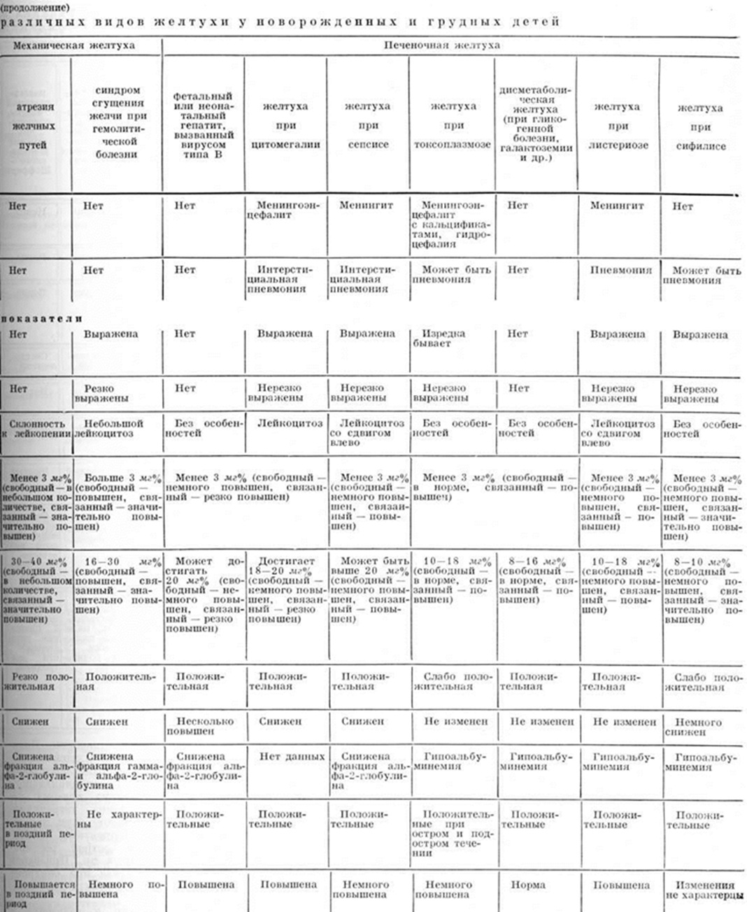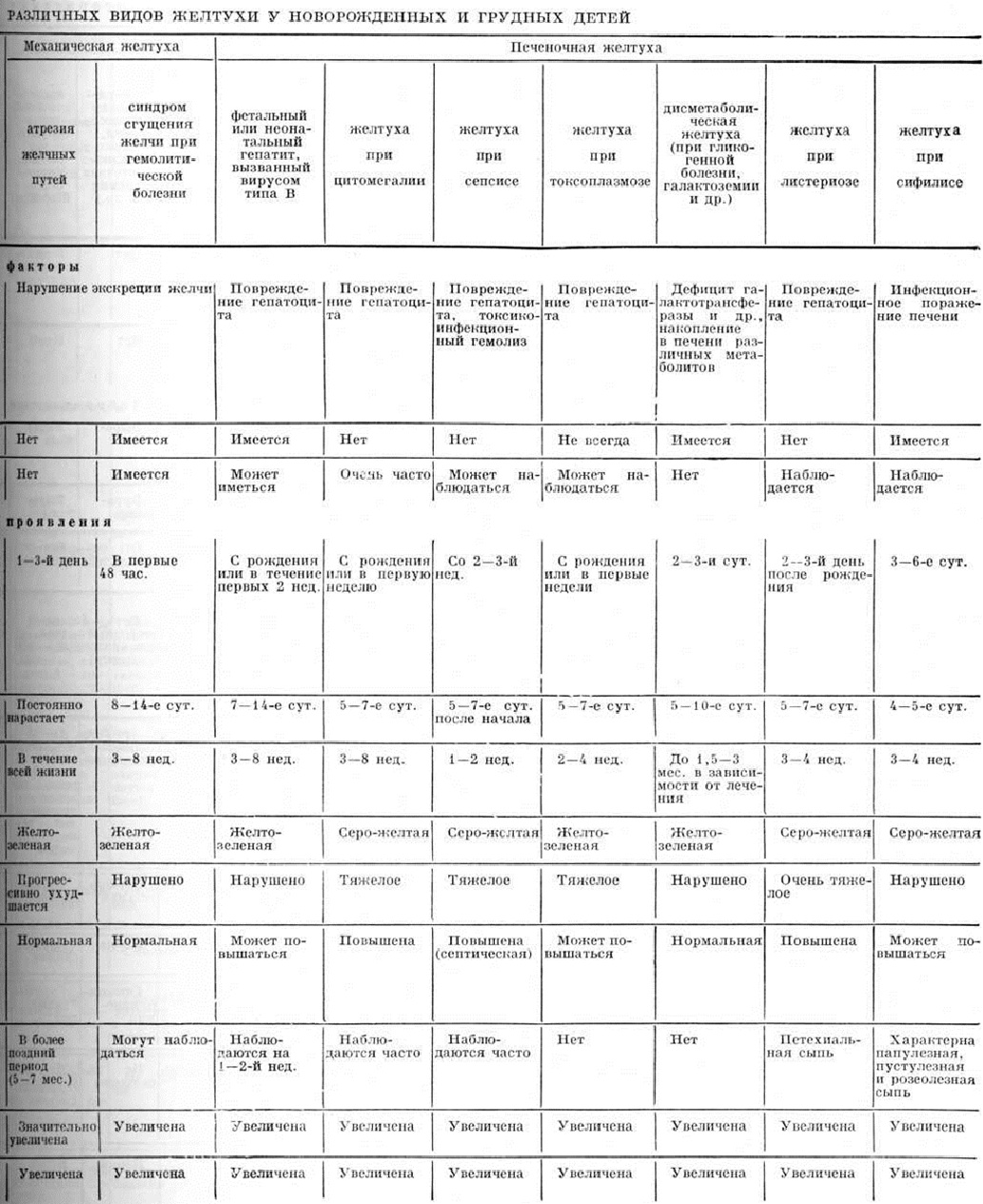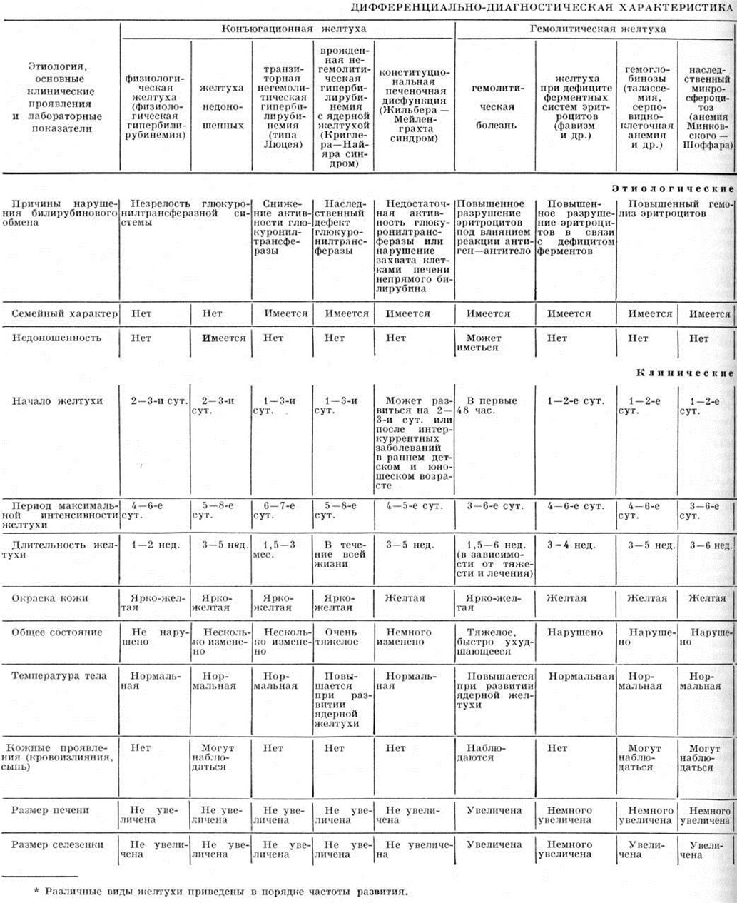 Конституциональная печёночная дисфункция юношеская и взрослых (синдром Жильбера — Мейленграхта) впервые описана Жильбером (N. A. Gilbert) в 1901 год под названием «холемия простая семейная». Причиной Желтуха, по мнению одних авторов, является нарушение захвата билирубина печёночной клеткой; по мнению других — нарушением конъюгации непрямого билирубина с глюкуроновой кислотой, что обусловлено наследственной неполноценностью глюкуронилтрансферазной системы. Наследуется заболевание по аутосомно-доминантному типу. Клинически заболевание характеризуется Желтуха, меняющейся по интенсивности, временами полностью исчезающей. И, связана с накоплением в крови непрямого билирубина, уровень которого в крови колеблется от 5 до 8 миллиграмм%. Начало появления желтухи значительно варьирует, начиная от периода новорожденности и до 10 летнего возраста. Желтуха сопровождается нарушениями со стороны желудочно-кишечные тракта: тошнотой, болезненностью в правой верхней половине живота, чувством полноты в желудке. Появление и усиление Желтуха у детей старшего возраста нередко отмечается после физических перегрузки, эмоционального напряжения, приёма некоторых лекарств (преднизолона, тетрациклинический, сульфаниламидов), при присоединении интеркуррентных заболеваний — ангины, острой респираторной инфекции и другие Признаков усиленного гемолиза при синдроме Жильбера—Мейленграхта не отмечено. Размеры печени и селезёнки в пределах нормы. Окраска кала и мочи нормальная. Лечение: в фазе усиления Желтуха назначают щадящую диету с ограничением жиров. Рекомендуется уменьшение физических нагрузки. Прогноз заболевания благоприятный. Гемолитическая желтуха связана с усиленным гемолизом эритроцитов, наступающим под влиянием антител матери при изоиммунизации, при дефиците или врождённой недостаточной активности глюкозо-6фосфатдегидрогеназы эритроцитов, а также при нарушении структуры эритроцита или структуры гемоглобина. Отмечается накопление в крови свободного билирубина, нормохромная анемия гиперрегенераторного характера, увеличение печени и селезёнки. К этому типу Желтуха относятся: Желтуха при гемолитической болезни новорожденных, связанная с несовместимостью крови матери и плода; Желтуха при дефиците ферментных систем эритроцита; гемоглобинозы. Лечение проводится с учётом этиологического фактора, вызвавшего усиление гемолиза, и направлено на предупреждение резкого накопления непрямого билирубина, который при высокой концентрации может вызвать поражение центральная нервная система с последующим отставанием ребёнка в физических и психическом развитии. Печёночная желтуха, обусловленная поражением паренхимы печени. Причиной поражения являются различные заболевания, вызываемые бактериями, вирусами, простейшими и другие В случаях Желтуха, связанной с гепатитом новорожденных, в крови может повышаться как непрямой, так и прямой билирубин. Если при этом уровень общего билирубина превышает 3—5 миллиграмм%, то независимо от этиологического фактора, явившегося причиной гепатита, устанавливается приблизительно постоянное соотношение между обеими формами билирубина, причём уровень непрямого билирубина иногда может даже несколько преобладать. Поражение паренхимы печени особенно неблагоприятно для новорожденных в связ