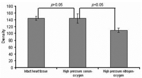 Electron microscopy showed diffuse endothelial cell damage marked perivascular space edema in the cardiac samples after straight freezing in liquid nitrogen under normal pressure (Figure 5B). Extensive capillary damage was in cardiac tissue after incubation at high-pressure nitrogen-oxygen gas mixture and cooling in liquid nitrogen as well (Figure 5C). Structure of capillary endothelial cells was relatively well preserved after applied cryostasis (incubation in high-pressure xenon-oxygen mixture followed by cooling in liquid nitrogen (Figure 5D). Discussion Living tissues cooled below the freezing point of water are damaged by the dehydration of the cells as ice is formed between the cells. The mechanism of freezing damage in living tissues has been elucidated by Renfret (1968) and Mazur (1984) [8, 9]. Ice formation begins in the intercellular spaces. The vapor pressure of the ice is lower than the vapor pressure of the solute water in the surrounding cells and as heat is removed at the freezing point of the solutions, the ice crystals grow between the cells, extracting water from them. As the ice crystals grow, the volume of the cells shrinks, and the cells are crushed between the ice crystals. Additionally, as the cells shrink, the solutes inside the cells are concentrated in the remaining water, increasing the intracellular ionic strength and interfering with the organization of the proteins and other intracellular structures. Eventually, the solute concentration inside the cells reaches the eutectic and freezes. The final state of frozen tissues is pure ice in the former extracellular spaces, and inside the cell membranes a mixture of concentrated cellular components in ice and bound water. In general, this process is not reversible to the point of restoring the tissues to life, although there are occasional exceptions observed in nature (vitrifying polyols (i.e., insects, amphibians), thermal hysteresis proteins (insects, fish) [10, 11]. Most lesions occur during re-warming and reperfusion of the cryopreserved biological tissuesorgans and the process of its development is time-consuming [8]. These changes included condensation of chromatin, large lipid droplets, and partly disrupted plasma membrane and can be seen on electron microscopy (which can be a consequence of the osmotic excursions incurred during a freeze-thaw cycle; leakage of mitochondrial matrix can trigger apoptosis as well). Damage by freezing is caused, besides temperature stress owing to decrease in temperature itself, through the following processes: irreversible change of biological membrane by dehydration from the cells and surface of the membranes caused by freezing process, destruction by loss in selective permeability or physical deformation and death of cell. Light microscopy doesn't show early freezing damage to the cells. The cryostasis technology is based on the concept of forming clathrates (xenon, sulfur hexafluoride, Freon-23, etc.) within the cells, thus reducing dehydration. Biological tissues can be saturated with the clathrate-forming gas(es) by diffusion or perfusion at the appropriate pressure in the range 1-50 bars at a temperature above clathrate-forming temperature. After saturation, the tissue is cooled, first below the clathrate-forming temperature, but above the freezing point of water, then to a temperature where the clathrates are metabolically stable at ambient pressure, and the pressure allowed to go to ambient. The tissue is then gradually cooled down to some appropriate temperature at normal atmospheric pressure and stored an indefinite time. This cryostasis method may protect tissues by retention of water inside the cells by clathrate formation of the water with the introduced gases, limiting the formation of ice outside the cells. Xenon is a nearly ideal clathrate-forming gas, forming clathrates above 0°C under relatively low pressure (two atmospheres) [12, 13]. Xenon has high skin permeability as well [14]. Even an early explanation for xenon anesthesia given by Pauling (1961) and Miller (1961) suggested that clathrate hydrate structures encapsulating the rare gas atoms are formed near synapses, impeding interneuronal transmission [15, 16]. Using xenon under high pressure (which is highly permeable) may prevent cells from freezing damage caused by intracellular dehydration. Our results also showed absence of mitochondrial swelling, rupture of inner and outer membranes, and leakage of mitochondrial matrix into the cytoplasm after applying the cryostasis protocol in comparing with freezing under high pressure of nitrogen. Intercellular freezing causes damage, not so much during the freezing process but rather in the course of thawing, during which re¬crystallization can occur [17]. Xenon clathrates are easily broken as the pressure drops, without intracellular water recrystallization (compared to damage after intracellular ice crystal formation). Cardiomyocytes serve as the best model to study dynamics of mitochondrial damage in clinical and experimental pathology. Safiulina et al (2006) demonstrated that loss of mitochondrial membrane potential leads to mitochondrial swelling [18]. It is well known that permanent ischemia causes loss of matrix density, and this is associated with mitochondrial swelling [19]. Another important sign of severe cellular damage is invagination of the cytoplasmic membrane. This was seen in our control cardiac samples after straight freezing in liquid nitrogen. This morphologic finding is especially seen after applying the cryopreservation procedures and indicates membrane damage [20]. Mitochondrial volume homeostasis is a housekeeping function that is essential for maintaining the structural integrity of the organelle [21]. Mitochondrial swelling is also one of the key players in cytochrome c release associated with apoptotic cell death. Our study used electron microscopy of the cryopreserved cardiac samples because this method can easily detect any ultra