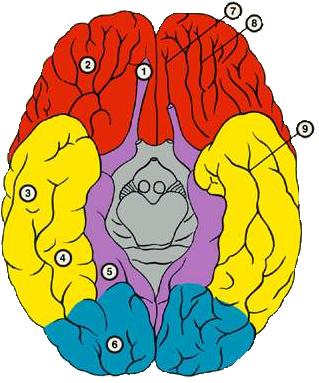 Лобные доли у человека являются структурной основой осуществления высших психических функций, которые проявляются в формировании личностных качеств, творческих процессов и влечений. Построение целенаправленного поведения, основанного на предвидении, резко нарушается при повреждении лобных отделов коры большого мозга (см. рис. №№1, 2, 3). Единство функционирования правого и левого полушарий коры головного мозга обеспечивается отростками нейронов, соединяющих между собой симметричные по функциям участки левого и правого полушарий ( комиссуральными волокнами), входящими в особое анатомическое образование, состоящее только из одних отростков нейронов ( комиссуральных волокон) и называемое мозолистым телом. При его повреждении или перерезке каждое полушарие начинает самостоятельно осуществлять свои специфические функции. У большинства здоровых людей доминирует левое полушарие, обеспечивая восприятие ( интерпретацию) и формирование устной и письменной речи, контроль за действиями правой руки. Правое полушарие обеспечивает правильное соотношение восприятия внешнего мира и действий человека в пространстве и времени, а также их взаимоотношения, кроме того правое полушарие участвует в музыкальном и художественном творчестве. С деятельностью коры головного мозга связаны такие высшие функции нервной системы, как сон и бодрствование, память и обучение, мышление и осознание воспринимаемой информации поступающей из окружающей среды. Наиболее обширные поражения коры головного мозга сопровождаются полным исчезновением психической деятельности. Поражение небольших участков (локальное) коры головного мозга, анализирующих и обрабатывающих поступающую информацию от отдельных органов чувств (проекционных корковых зон отдельных анализаторов), а также участков управляющих мышечными движениями, приводит к тому, что человеку становится сложно, либо вообще невозможно, выполнять целенаправленные движения. Иначе говоря, приводит, к развитию парезов и параличей, к потере зрения, слуха, чувствительности, несмотря на то, что органы этих чувств работают совершенно нормально. В связи с тем, что разрушены центры, приема, обработки и передачи поступающей от того или иного органа чувств информации, находящиеся в коре головного мозга; такие нарушения называются центральными выпадениями. Поражение ассоциативных полей коры головного мозга сопровождается нарушением возможности целенаправленных действий ( апраксией), узнавания ранее известных предметов, людей, образов и явлений ( агнозией), поражение речевых зон коры головного мозга сопровождается расстройствами речи, письма и чтения ( афазия, алалия, аграфия, алексия). Поражение лобной доли в области передцентральной извилины (см. рис. №1 – 1 и рис. №2 – 2) сопровождается параличом одной из конечностей ( моноплегией), или параличом одной половины тела ( гемиплегией), недостаточностью иннервации лицевого и подъязычного нервов по центральному типу. Это приводит к полному или почти полному отсутствию лицевой мимики, затруднению или полной невозможности жевательных и глотательных движений, нарушению слюноотделения, и т.д. Поражение задних отделов средней лобной извилины (коркового центра взора) (см. рис. №1 – 3) приводит к параличу или частичному параличу ( парезу) взора с насильственным 
