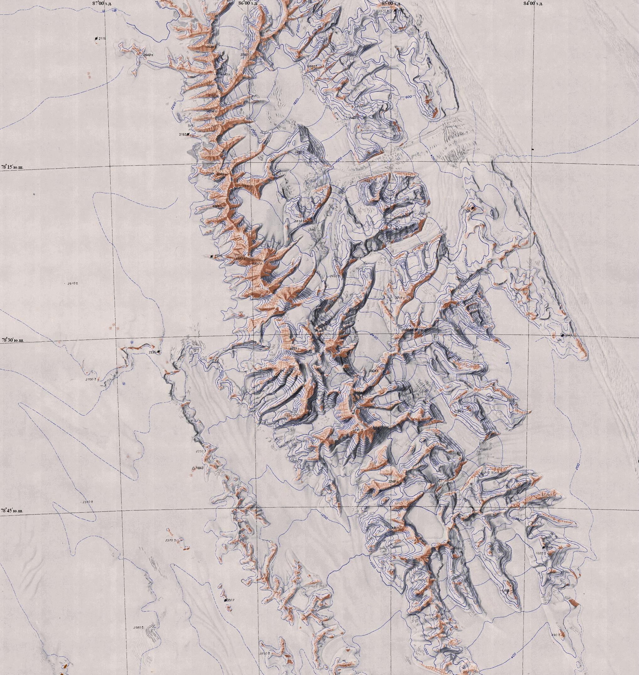 Массив Винсон находится на широте 78 — 79 градусов южной широты, высота на которой выходы скал ( нунатаки) над поверхностью снегового покрова более 2000 метров. Это соответствует, по градиентам температур, максимально возможной температуре –8,7 градуса Цельсия, что превышает указанный в пункте 2 максимум на 1,7 градуса. Понижение максимальной температуры выведено следующим образом расстояние по горизонтали между 69 и 79 градусами южной широты ~ 1000км. в соответствии с горизонтальным градиентом это составит(0,6 * 10) = 6 градусов Цельсия. Высота нунатаков в районе гор Элсруэт не менее 2000 метров над уровнем океана, следовательно, вертикальный градиент температур составит (0,55 * 20) = 11 градусов Цельсия. В сумме общий градиент температур равен 17 градусов Цельсия. В результате получаем 17 – 9,3 = 7,7 градуса Цельсия, что укладывается в необходимый температурный интервал.