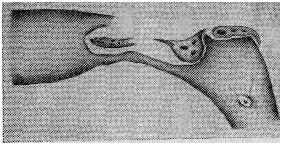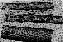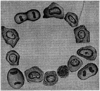 Такое поразительное размножение прежде всего указывает на то, что этот старческий признак не зависит от истощения способности размножения клеток, как предполагают некоторые теории механизма старости. При мускульной атрофии вместо истощения воспроизводительной способности наблюдается, наоборот, усиленное проявление ее. Вот, следовательно, новый пример, наряду с сединой волос и атрофией нервных клеток, указывающий на то, что при старческом перерождении тканей мы имеем дело с особыми явлениями, вовсе не зависящими от способности размножения клеток. Точно так же, как при атрофии мозга, наблюдают увеличение невралгии, ткани, содержащей невронофаги, так и при мускульной атрофии наблюдают размножение мускульных ядер. Но одновременно с ядрами увеличивается и количество протоплазматического вещества мускульных волокон — вещества, называемого саркоплазмой. Последнее замещает поперечнополосатое вещество мускулов — миоплазму посредством процесса, относящегося к разряду фагоцитарных явлений. В нормальном мускульном волокне оба эти вещества, так же как и относящиеся к саркоплазме ядра, находятся в полном равновесии; в старости же саркоплазма со своими ядрами возрастает за счет сократимого вещества. Равновесие нарушается, и в результате наступает ослабление мускульной силы. При этих условиях саркоплазма становится фагоцитами миоплазмы точно так, как хромофаги становятся фагоцитами пигмента волос или невронофаги — фагоцитами нервных клеток. Изучение других примеров мускульной атрофии, а именно атрофии мускулов хвоста головастиков лягушки, не оставляет ни малейшего сомнения насчет значения явлений, наблюдаемых в старости. В обоих случаях мы имеем дело с разрушением сократимого вещества мускулов особыми фагоцитами — миофагами. Среди странных явлений старческой атрофии следует упомянуть тот факт, что рядом с отвердением, или склерозом, многих органов самая твердая часть нашего организма — скелет — становится менее плотной. Вследствие этого наступает столь опасная в старости хрупкость костей. Последние в этом возрасте менее плотны, но более пористы и поэтому легче. Казалось бы, что макрофаги, которые разрушают нежные элементы, как нервные клетки или сократимое вещество мускулов, не должны бы быть в состоянии изгрызть твердое костное пропитанное минеральными солями вещество. И действительно, механизм атрофии костей не может быть отнесен к разряду тех фагоцитарных явлений, которые наблюдаются в других органах. Тем не менее мы и тут имеем дело с вмешательством клеток, весьма сходных с некоторыми макрофагами. Клетки эти многоядерные и называются остеокластами. Они развиваются вокруг пластинок костного вещества и вызывают их исчезновение. Но они не способны отделять частичек костей и растворять их в своем содержимом. Хотя внутренний механизм разрушительной роли остеокластов еще недостаточно выяснен, но более чем вероятно, что клетки эти выделяют какое-то кислое вещество, растворяющее известковые соли, что и вызывает размягчение костного вещества. Явление это наблюдается в различных примерах повреждения костей и, между прочим, при старческом перерождении их, как это видно на прилагаемом рисунке (рис. 9). Благодаря деятельности остеокластов, этих видоизмененных макрофагов, часть извести нашего скелета в старости 