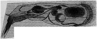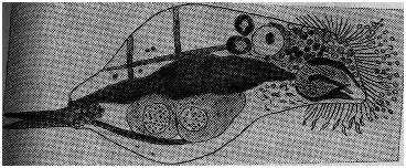 Остается предположить, что естественная смерть самцов зависит от отравления вследствие недостатка обмена в собственных тканях. Мы уже знаем, какую важную роль играет самоотравление организма. Обилие выделительных органов показывает, что у самцов коловраток происходит обмен веществ, одни из которых должны удаляться наружу. Когда же выделения эти недостаточны, то должно наступить отравление тканей. Так как агония начинается с прекращения координации движений, то надо полагать, что смертельное самоотравление самцов прежде всего касается нервных центров; мерцательные же реснички и мускулы затронуты только в конце умирания. Несомненно, что самцы коловраток кончают свое существование естественной смертью в строжайшем смысле слова. Но не следует думать, что самки, снабженные вполне развитыми пищеварительными органами, умирают иначе. Жизнь самок коловраток длиннее и сложнее, чем у самцов; вследствие этого они подвержены гораздо большим случайностям. Так, самки иногда умирают от голода или других внешних причин. Но если устранить эти неблагоприятные влияния, то они живут около двух недель, а затем все же умирают естественною смертью. Явления последней совершенно сходны с описанными у самцов. Но не одни коловратки подвержены спокойной естественной смерти, так резко отличающейся от бурной смерти пилидиума и диплогастера. Мы встречаем немало сходных примеров среди беспозвоночных. Не буду входить в подробности, а ограничусь только несколькими фактами. Один американский естествоиспытатель, Дана, уже более 50 лет тому назад открыл на поверхности моря столь странное маленькое животное, что дал ему название «монстрилла». Это мелкое ракообразное приближается к циклопам, так часто встречаемым в болотах. Но в то время как последние снабжены всем необходимым для захвата добычи и переваривания ее, у монстрилл нет ни хватательных органов, ни даже кишечного канала. Они снабжены богатыми мускулами, нервной системой, органами чувств и половыми органами. Им недостает только всего нужного для продления жизни через питание. Они, следовательно, заранее обречены на естественную смерть. Эти странности строения были выяснены только несколько лет тому назад исследованиями Малакэна. Монстриллы проводят целый период своего существования в качестве паразитов некоторых кольчатых червей. В это время они накапливают необходимый материал для образования половых продуктов (яиц и семенных тел) и для свободной жизни в море во время развития своего потомства. У монстрилл не только самцы, но и самки лишены органов пищеварения. Это тем замечательнее, что самки у них носят при себе яйца до самого вылупления из них нового поколения (подобно тому, как самки рака, лангусты и многих других ракообразных) (рис. 17). Малакэн думает, что монстриллы умирают от голода. «Лишенные пищеварительных, хватательных и жевательных органов, — говорит он, — монстриллы не имеют никакой возможности питаться и после кратковременной жизни неминуемо обречены на голодную смерть. Предположение это логически вытекает из особенностей их строения». В пользу этой гипотезы Малакэн приводит тот факт, что перед смертью ткани и органы монстрилл представляют явные признаки дегенерации. «Прежде всего обнаруживается дегенерация на глазах. Пигмент растворяется и мало-помалу исчезает; зри