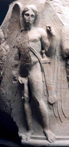 Танатос крылатый юноша, с погашенным факелом в руке и разящим мечом. Танатос обычно находится у трона Аида, но есть версия, по которой он – постоянно перелетает от одного ложа умирающего к другому, срезая при этом мечом прядь волос с головы умирающего и забирая его душу. Бог сна Гипнос всегда сопутствует Танатосу: на античных вазах, часто, Гипнос и Танатос изображены рядом.