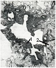 Патологическая анатомия.Абсцесс всегда возникает либо в уже погибших тканях, в которых нарастают микробно-химические процессы аутолиза (например, при травме), либо в живых тканях, подвергающихся сильному микробному воздействию (например, при инфекциях). По характеру течения абсцесса может быть острым и хроническим. В начальном периоде формирования абсцесса инфильтрируется воспалительным экссудатом и лейкоцитами ограниченный участок ткани. Постепенно под влиянием ферментов лейкоцитов ткань подвергается расплавлению, и образуется полость, заполненная гнойным экссудатом. Форма полости может быть как простой округлой, так и сложной, с многочисленными карманами. Стенки абсцесса в ранней стадии его формирования покрыты гнойно-фибринозными наложениями и обрывками некротизированных тканей. В дальнейшем по периферии абсцесса развивается зона демаркационного воспаления, составляющий ее инфильтрат служит основой для формирования пиогенной мембраны, образующей стенку полости (рис. 1). Пиогенная мембрана представляет собой богатый сосудами слой грануляционной ткани. Постепенно в той ее части, которая обращена в сторону окружающих абсцесса тканей, происходит созревание грануляций. Таким образом, если абсцесс приобретает хроническое течение, в пиогенной мембране образуются два слоя: внутренний, обращенный в полость и состоящий из грануляций, и наружный, образованный зрелой соединительной тканью (рис. 2). В различных органах абсцессы обладают некоторыми особенностями, отражающими своеобразие строения и функции этих органов. Так, при абсцессе печени в его содержимом имеется примесь желчи; возникают участки эпителизации пиогенной мембраны. Абсцесс, как правило, заканчивается спонтанным опорожнением и выходом гноя на поверхность тела, в полые органы или в полости тела. Прорыв абсцесса на поверхность тела или в полый орган при условии хорошего дренирования гнойной полости и отсутствии рубцовой капсулы нередко ведет к ликвидации полости абсцесса путем рубцевания. Сравнительно редко абсцесс подвергается инкапсуляции. При этом гной сгущается, выпадают кристаллы холестерина, вокруг абсцесса образуется толстая рубцовая капсула, содержащая ксантомные клетки. Иногда абсцесс, возникающие вокруг животных паразитов, подвергаются петрификации. Если сообщение абсцесса с поверхностью тела недостаточно или имеются другие причины, препятствующие спадению стенок полости абсцесса, то после его опорожнения формируется свищ — узкий канал, выстланный грануляционной тканью или эпителием, который соединяет полость абсцесса с поверхностью тела или с просветом полого органа. Свищ часто возникает в тех случаях, когда в полости абсцесса содержатся инородные тела или секвестры. При некоторых заболеваниях вследствие особенностей гноя он может активно расплавлять окружающие ткани, распространяться по межтканевым щелям и скапливаться в местах, отдаленных от первичной локализации абсцесса, например так называемые холодные абсцессы (натечники), характерные для туберкулеза, которые также могут опорожняться через свищевые ходы. Клиническая картина.Образовавшиеся в результате гнойного или асептического воспаления абсцессы имеют различный исход: спонтанное вскрытие с прорывом наружу (абсцесс подкожной клетчатки, мышечный абсцесс, ма