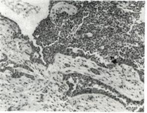 Макроскопически различают две формы адамантиномы — солидную (adamantinoma solidum) и поликистозную (adamantinoma polycysticum). Эти две формы опухоли не являются самостоятельными. Солидная форма — более ранняя стадия развития опухоли, чаще наблюдается в верхней челюсти и растет быстрее, чем поликистозная. На разрезе солидная адамантинома представляет собой узел мягковатой или плотноватой консистенции грязно-серого или красноватого цвета, капсула может отсутствовать. Поликистозная форма адамантиномы характеризуется наличием нескольких кист. Кисты выполнены светлой или бурой жидкостью различной консистенции. При микроскопическом исследовании (Рис. 1.) выявляются характерные разветвляющиеся эпителиальные тяжи или округлые участки, между которыми проходят соединительнотканные прослойки, содержащие кровеносные и лимфотические, сосуды. До периферии этих эпителиальных комплексов располагаются в один ряд высокие цилиндрические клетки с крупными ядрами, за которыми следуют кубические и полигональные клетки. В центре эпителиальных комплексов расположены звездчатые клетки. Указанная картина сходна со строением развивающегося эмалевого органа зуба.
