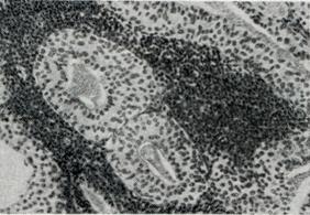 Макроскопически аденолимфома представляет собой округлый или дольчатый узел не более 8 сантиметров в диаметре, мягкой консистенции, иногда содержащий кисты и обычно полностью инкапсулированный. Микроскопически (рис. 1.) аденолимфома состоит из трубчатых желез с нитевидными или широкими сосочками, выстланными высоким светлым цилиндрическим эпителием. В строме опухоли расположены многочисленные лимфоциты, формирующие фолликулы с центрами размножения. Лимфоидный компонент не является опухолевым ингредиентом, и поэтому термин «аденолимфома» не вполне правомерен. Аденолимфома возникает в любом возрасте, но обычно развивается у мужчин после 40 лет и составляет около 6% всех эпителиальных опухолей слюнных желез. Чаще аденолимфома располагается в области нижнего полюса околоушной слюнной железы, в ее толще или непосредственно у наружной границы органа. Нередко поражение бывает двусторонним или в виде множественных изолированных узелков. Аденолимфома может возникать в слюнных железах другой локализации или слезной железе.