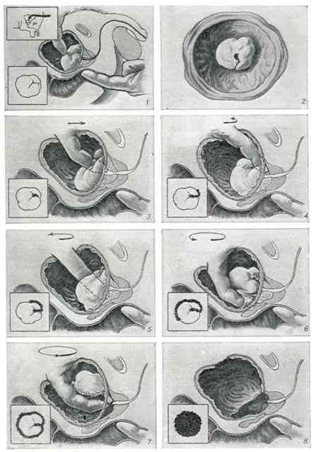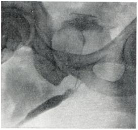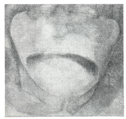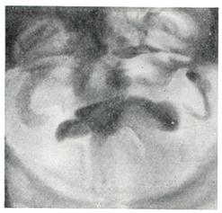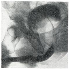 Ректальное пальцевое исследование аденомы предстательной железы проводят в коленно-локтевом положении пациента или в положении на правом боку с согнутыми в коленях и плотно притянутыми к животу бедрами. В последнем случае врач стоит со стороны лица больного и лицом к нему. Исследование следует проводить после мочеиспускания или катетеризации мочевого пузыря. При аденоме предстательной железы размеры долей ее увеличиваются равномерно или асимметрично, срединная бороздка может быть сглажена, верхний край железы при сильном ее увеличении недоступен для пальцевого исследования; консистенция железы бывает мягко-железистой, или плотновато-фиброзной. Если консистенция весьма плотная и очаги уплотнения отличаются хрящевой или деревянистой плотностью, предполагают рак. При аденоме предстательной железы слизистая оболочка прямой кишки над предстательной железой всегда подвижна, при раке (особенно далеко зашедшем) малоподвижна, грубо складчата и может давать ощущение легкой крепитации. Чувствительность предстательной железы при ее аденоме невелика, усиливается при воспалительных изменениях. Рентгенологическое исследование.Применяют экскреторную урографию, цистографию и уретроцистографию; наиболее рациональна лакунарная уретроцистограмма по Кнайзе и Шоберу (рис. 4). Кислород, введенный по катетеру в количестве 150—200 мл, растягивает мочевой пузырь в виде купола. Введенное вслед за кислородом жидкое контрастное вещество (20% раствор сергозина в количестве 20 мл) располагается в области дна мочевого пузыря, выявляя внутрипузырный рост аденомы предстательной железы. Этим методом определяют ряд типичных рентгенологических симптомов: «берета» (рис. 5), удлинения мочеиспускательного канала (рис. 6), «клинка сабли» (рис. 7), приподнятого дна. Экскреторная урография, помимо определения функции почек, указывает на состояние нижних отрезков мочеточников, которые крючкообразно приподнимаются кверху, давая изображение «рыболовного крючка» (рис. 8). Рентгенологическое исследование выявляет также сопутствующие заболеванию камни и дивертикулы. Эндоскопические методы исследования — цистоскопию, уретроскопию (см.) — следует проводить только при гематурии, подозрении на опухоль мочевого пузыря или для дифференциальной диагностики в неясных случаях. Уретроскопия показана в ранней стадии заболевания и не у пожилых, больных. При цистоскопии выявляются выбухания переходной складки в виде занавески (рис. 9), определяется средняя доля в виде барьера, уточняется наличие камней и сопутствующих заболеваний — цистита, язвы, папилломы. Во II и III стадиях заболевания цистоскопия затруднительна, может быть причиной развития инфекции, возникновения простатита и эпидидимита. Поэтому в последние годы большинство урологов предпочитает проводить цистоскопию в операционной перед операцией.