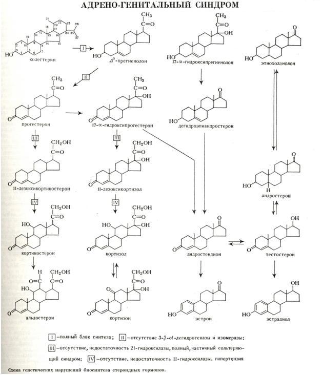 Недостаточность образования кортизола приводит к избыточному выделению АКТГ, в результате чего синтез андрогенов усиливается, отмечается избыточное образование производных прогестерона, в особенности прегнантриола, значительно увеличивается выделение с мочой 17-кетостероидов. Большое число исследователей считает возможным определить адрено-генитальный синдром как дисфункцию коры надпочечников, при которой происходит усиление образования одних кортикостероидных гормонов и уменьшение образования других. Избыток андрогенов может тормозить половое развитие по изосексуальному (интерсексуальному) типу у женщин. Возможно также антагонистическое действие андрогенов по отношению к эстрогенам на тканевом уровне.