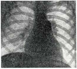 Рентгенологические признаки зависят от характера бронхо-легочного заболевания, а при его отсутствии соответствуют картине первичной легочной гипертензии. При рентгеноскопии видна усиленная пульсация легочного ствола и крупных ветвей легочной артерии и, как и на рентгенограммах (рис. 1.), определяются выбухание дуги легочного ствола, увеличение калибра артерий в корнях и прикорневых зонах легких, «ампутация» теней сегментарных сосудов и отсутствие легочного рисунка в периферических отделах легочных полей. В правом переднем косом положении отмечаются выбухание легочного конуса и увеличение диаметра круглой тени левой легочной артерии в ортогональной ее проекции. В левом переднем косом положении «аортальное окно» закрыто тенью расширенного легочного ствола; обычно, как и в боковом положении, имеются признаки увеличения правого желудочка.