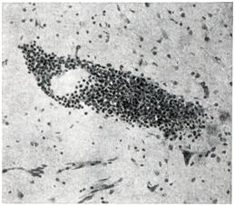 Происходит перерождение пирамидного пучка на всем его протяжении, больше в стволе головного мозга и спинном мозге; в последнем часто страдают передние и задние столбы (рис. 2). Всегда отмечаются воспалительные изменения и периваскулярные инфильтрации, в основном в нижних отделах ствола и спинном мозге (рис. 3). Имеет место пролиферация всех видов глии, особенно микро- и олигодендроглии. В клетках передних рогов спинного мозга людей, погибших от амиотрофического бокового склероза, и экспериментальных обезьян были выявлены цитоплазматические включения (Т. Л. Бунина).