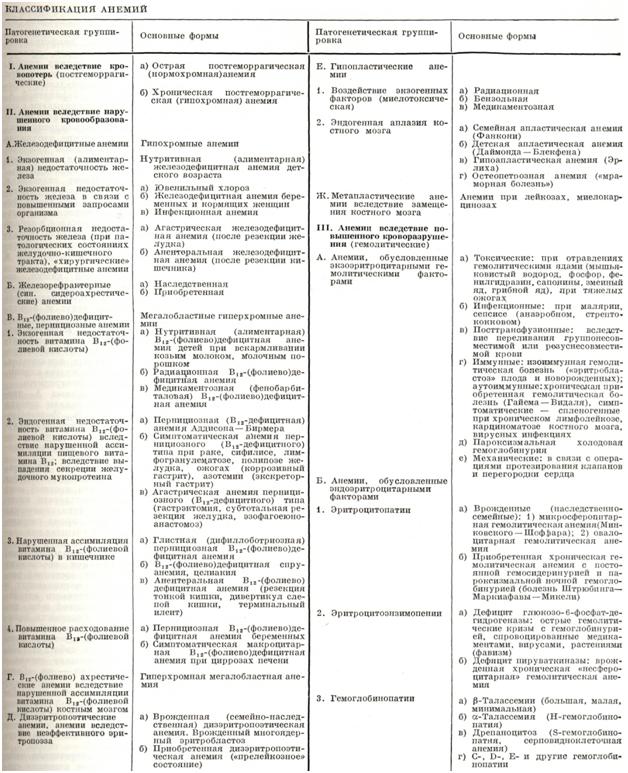 При анемии выявляется комплекс изменений, отражающих острую или хроническую недостаточность кровоснабжения. Характер изменений зависит от формы анемии, фазы развития и проводимой терапии. Макроскопически отмечается бледность и нередко желтушность кожи. При хронической анемии отмечается развитие подкожной жировой клетчатки, жировой ткани в брыжейке, сальнике и вокруг внутренних органов. Мышца сердца дряблая, тусклая, в области иапиллярных мышц может наблюдаться желтый крап. Печень на разрезе бледно-серого цвета, рисунок долек стерт. Селезенка часто уменьшена в размерах, капсула морщиниста, на разрезе пульпа дает соскоб. В толще жировой ткани брыжеек могут выявляться множественные мелкие (0,3—0,4 см в диаметре) лимфатические, узлы темно-красного цвета. Костный мозг плоских костей обычного вида, в средней и нижней трети бедра жировой, с участками кроветворения розово-красного цвета. Иногда костный мозг становится деятельным на всем протяжении бедра. Микроскопическое исследование выявляет жировую дистрофию в мышце сердца и в печени, а также отложение липидов в цитоплазме клеток эндотелия сосудов головного мозга, паренхиматозных органов. Обнаруживаемые в костном мозге изменения различны в зависимости от остроты и формы процесса и эффективности проведенного лечения. Гистологическое исследование биопсий костного мозга позволяет уточнить степень его поражения и способствует дифференциации с другими заболеваниями. Изучение биопсий костного мозга в динамике болезни позволяет установить эффективность терапии и активность процессов регенерации костного мозга. Симптомы заболевания бывают более или менее выражены в зависимости от степени анемизации и адаптации больного. Обычно отмечается слабость, быстрая утомляемость, одышка и сердцебиение при физической нагрузке, бледность кожи и слизистых оболочек. При глубокой анемии, особенно при ее быстром развитии, возникают частые головокружения, шум в ушах, нарушение зрения в виде мелькания «мушек» перед глазами, снижение остроты зрения, иногда вплоть до полного амавроза в связи с нарушением питания зрительных нервов в результате гипоксии. При выслушивании сердца определяется «дующий» систолический шум у верхушки и на соустьях, возникающий в результате гидремии и компенсаторного ускорения кровотока. Анемия агастрическая возникает обычно после полного удаления (гастрэктомии) или субтотальной резекции желудка. Частичная резекция, широко применяемая при язве желудка, как правило, не сопровождается анемией. Лишь у части больных (преимущественно у женщин) наблюдается железодефицитная анемия. Агастрическая анемия бывает железодефицитная и В12-(фолиево) дефицитная; проявляется обычно в сроки от 3 до 5 лет после операции гастрэктомии, иногда раньше — через 1— 1½ года. От классической пернициозной анемии Аддисона — Бирмера агастрическая В12-дефицитная анемия отличается меньшей выраженностью симптомов внутрикостномозгового гемолиза (на почве дизэритропоэза). Лечение агастрической анемии проводится по тем же принципам, что и лечение пернициозной анемии при железодефицитной анемии. Профилактика агастрической анемии заключается в своевременном (еще до развития явлений В12-недостаточности) назначении витамина В12 в инъекциях до 100 — 200 мкг 1—2 раза в месяц, начиная с первых м