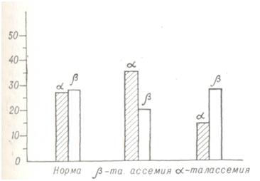 Индикаторные количества препаратов в зависимости от пробы колеблются от 1—5 мккюри Сг51, Со58, Fe59 до 200 мккюри Сг51. Измерительная аппаратура: счетчики сцинтилляционные жидкостные, а также с цельным и колодезным кристаллами, сканеры и гамма-камеры. Показатели нормы для большинства методов имеют относительное значение, так как зависят от деталей применяемых методик. Информативность радиоизотопных методов больше, чем неизотопных. В отличие от ранее распространенного метода дифференциальной агглютинации, при котором определяется продолжительность жизни только донорских (перелитых) эритроцитов, радиоизотопный метод позволяет определить продолжительность жизни и эритроцитов реципиента. В клинической практике единственным методом, позволяющим определить массу депонированных эритроцитов, является изотопный метод. Радиоизотопный метод более чувствителен, чем неизотопные методы выявления желудочно-кишечныъ кровотечений. Он дает возможность количественно определить величину кровопотери на протяжении достаточно долгого времени, что важно в оценке кровопотери как фактора, вызывающего постгеморрагическую анемию (смотри Желудочно-кишечное кровотечение, радиоизотопная диагностика). Особенно целесообразно применение радиоизотопных тестов при затруднениях в диагностике таких анемий, как железо- и В12-дефицитные, железорефрактерные, Маркиафавы — Микели (рис. 1), апластическая. Диагноз аталассемии можно поставить только с помощью радиоизотопного метода. На рис. 2 показано, что в норме включение С14-аспарагиновой кислоты в α- и β-цепи глобина почти одинаково. При β-талассемии уменьшено включение С14-аспарагиновой кислоты в β-цепи, при α-талассемии — в α-цепи. Радиоизотопное определение степени разрушения эритроцитов в селезенке при гемолитической анемии помогает установить показания к спленэктомии. Смотри также Кровь, радиоизотопные исследования, Эритроциты, радиоизотопные исследования. С целью изучения механизма возникновения анемия, процессов регенерации крови, выявления недостаточности кроветворной системы и разработки методов терапии искусственно воспроизводится малокровие у животных. Экспериментальную анемию можно вызвать кровопусканием, разрушением эритроцитов гемолитическими ядами, нарушением целостности различных структурных образований нервной системы, удалением органов и другим. Постгеморрагическую анемию вызывают кровопусканием, котрое делают однократно в количестве 30—40% объема циркулирующей крови (28—35 мл/кг) или повторно 10 — 15 раз по 10—12%; у кошек можно удалить 40—50% объема крови, у крыс и кроликов — не более 30%. Потеря 60—70% крови смертельна. Массивное кровопускание вызывает у собак торможение функции коры больших полушарий в течение 7 — 8 дней, изменение сосудистых и дыхательных рефлексов, понижение артериального давления, гипоксемию и кислородное голодание. Объем крови уменьшается лишь в самом начале кровопотери, затем восстанавливается за счет жидкости, поступающей из тканей. Снижается гемоглобин, число эритроцитов, содержание белков плазмы. Сыворотка животных в течение 5—7 дней приобретает гемолитические свойства: происходит разрушение части эритроцитов и дальнейшее снижение количества эритроцитов и гемоглобина. Эти изменения тем более выражены, чем массивнее кровопускание. Продукты рас