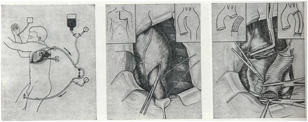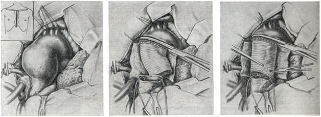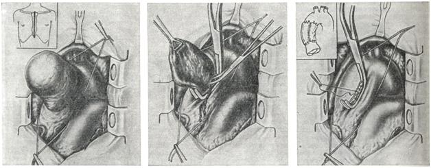 Радикальное лечение заключается в резекции измененного участка аорты с последующей аллопластикой. Все вмешательства по поводу аневризмы аорты производят под интубационным наркозом. В зависимости от расположения аневризмы операцию производят или с применением искусственного кровообращения (аневризмы восходящей и нисходящей аорты и ее дуги), или с использованием различных методов шунтирования. При вмешательствах на дуге аорты иногда комбинируют искусственное кровообращение с обходным шунтированием для обеспечения кровоснабжения головы. Аневризма восходящей аорты (рис. 1—3). Оперативный доступ — продольная стернотомия. После вскрытия перикарда и подключения аппарата искусственного кровообращения выделяют аневризму восходящей аорты и на аорту накладывают поперечно зажим проксимальнее места отхождения ветвей брахицефального ствола. При искусственном кровообращении с постепенным охлаждением крови до t° 28—30° аневризму вскрывают поперечным разрезом, в устья обеих коронарных артерий вводят специальные канюли для проведения коронарной перфузии. После этого производят резекцию самой аневризмы. Дефект аорты замещают алло-трансплантатом. Ввиду того что операция выполняется в условиях искусственного кровообращения (гепаринизированная кровь), трансплантат должен быть непроницаемым для крови. Вначале выполняют дистальный анастомоз аорты с протезом, а затем проксимальный. На этом этапе операции в случае необходимости может быть произведена коррекция недостаточности аортальных клапанов. После наложения швов больного согревают до обычной температуры и продолжают искусственное кровообращение до того момента, когда левый желудочек оказывается в состоянии поддерживать кровообращение. Перед зашиванием операционной раны правую медиастинальную плевру широко вскрывают и устанавливают дренажи в правой плевральной полости и перикарде.