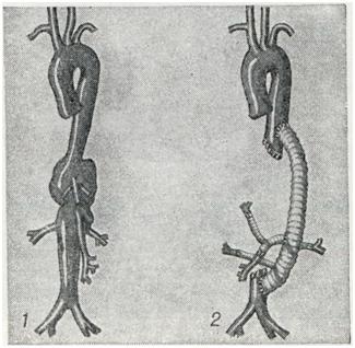 Аневризма брюшной аорты. Почти в 90% случаев аневризма располагается ниже почечных артерий, нередко распространяется и на бифуркацию аорты. Доступ — срединная лапаротомия от мечевидного отростка до лобка. По вскрытии брюшной полости кишечник отодвигают вправо, вскрывают задний листок брюшины, выделяют третий отдел двенадцатиперстной кишки у plica duodenojejunalis. Выделяют левую подвздошную артерию и мочеточник. Далее выделяют нижнюю брыжеечную артерию и пересекают ее, при этом освобождается верхний полюс аневризмы. Иногда приходится оставить часть нижней брыжеечной артерии на аневризме. Далее окончательно выделяют проксимальный отдел аорты и левую почечную вену. Осматривают подвздошные артерии и выбирают место для будущего анастомоза с протезом. Желательно сохранить внутреннюю подвздошную артерию, чтобы обеспечить хорошее кровоснабжение сигмовидной кишки и пещеристых тел полового члена (профилактика импотенции). Нередко приходится выбирать место анастомоза на наружной подвздошной артерии. Если же она поражена атеросклеротическим процессом и стенозирована, то надо сделать туннель под паховой связкой и использовать для анастомоза бедренную артерию. Нижнюю полую вену отделяют от аневризмы аорты сначала сверху, в том месте, где проходит левая почечная вена.