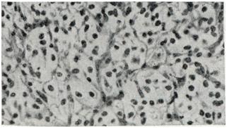 Микроскопически в ткани ангиоретикулемы обнаруживаются два компонента: 1) густая сеть сосудов капиллярного типа, имеющих вид каналов, щелей, более широких крововместилищ; стенки сосудов образованы одним слоем клеток эндотелия, 2) полигональные клетки со светлой цитоплазмой и небольшим ядром, содержащим нежную хроматиновую зернистость, располагающиеся между сосудами (рис. 1). Местами границы между клетками не видны или клетки формируют ретикулярную структуру. Часто цитоплазма содержит включения анизотропных липоидов («пенистые», «ксантомные» клетки).