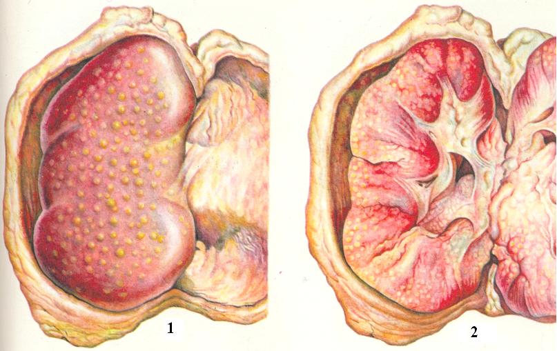 Патогенез.Клиническая картина.Апостематозный нефрит наблюдается в любом возрасте, несколько чаще у женщин. Односторонний процесс встречается у 96,6%, двусторонний — у 3,4% больных. Клиническая картина слагается из признаков, типичных для общего тяжелого инфекционного процесса с глубокой интоксикацией: головная боль, общее недомогание, высокая температура постоянного или ремиттирующего типа, озноб. Иногда эти явления выражены столь интенсивно, что дают повод предполагать острое инфекционное заболевание. Спустя некоторое время появляются симптомы локального характера: боль в поясничной области, иррадиирующая в верхнюю часть живота, плечо, по ходу мочеточника или в бедро. Апостематозный нефрит может сопровождаться бактериемическим шоком: резкое ухудшение общего состояния, бледность кожных покровов, акроцианоз, слабый пульс, падение артериального давления, учащенное дыхание. При пальпации определяют болезненность в области пораженной почки, напряжение мышц поясничной области и брюшной стенки. Часто отмечают резкую болезненность в области реберно-позвоночного угла. Важными признаками гнойного процесса в почке являются пиурия и бактериурия. В начальной стадии апостематозного нефрита изменений в моче может и не быть, так как кортикально расположенные гнойники лишь иногда прорываются в почечную лоханку. Позднее в моче появляются эритроциты, лейкоциты, незначительная альбуминурия и микрогематурия, бактериурия (у 85% больных находят в 1 мл мочи более 100 тыс. бактерий). В крови нередко выраженный лейкоцитоз со значительным нейтрофилезом. Осложнения. Наиболее частое осложнение апостематозного нефрита — паранефрит. Наиболее опасное осложнение апостематозного нефрита — септикопиемия, при которой может поражаться и другая почка. При локализации процесса в верхнем полюсе почки может возникать поддиафрагмальный абсцесс и реактивный плеврит, а при локализации в нижнем полюсе — картина псоита. В случаях, когда гнойники располагаются преимущественно на передней поверхности почки, наблюдаются перитонеальные явления и иногда картина острого живота. Апостематозный нефрит может осложниться также флегмоной забрюшинной клетчатки. Диагноз устанавливается на основании клинической картины заболевания и специальных методов исследования. В распознавании стороны поражения известную помощь оказывает так называемый сравнительный лейкоцитоз: количество лейкоцитов в крови, взятой из кожи поясничной области со стороны пораженной почки, больше, чем в крови, взятой из кожи поясничной области противоположной здоровой стороны и из пальца руки. Находит применение новый метод исследования и диагностики — цветная термография кожи поясничных областей. Термография основана на способности холестерических жидких кристаллов изменять свой цвет в ответ на малейшие локальные колебания температуры тела. Благодаря этому методу удается установить и уточнить локализацию воспалительного процесса в почках (смотри Термография). При апостематозном нефрите имеются следующие рентгенологические признаки: увеличение размеров почки у 80% больных, сколиоз в сторону поражения — у 79%, смазанность или отсутствие контура поясничной мышцы — у 78% , нечеткость тени чашечно-лоханочной системы на экскреторной урограмме — у 48%, симптом ореола разрежения во