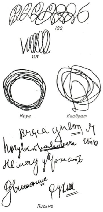 Оральная апраксия представляет особый вид апраксии речевого аппарата, при которой развиваются затруднения моторной речи, принимающие формы афферентной (кинестетической) моторной афазии. Больной не может найти позиций речевого аппарата, нужных для произнесения соответствующих звуков — артикулем, и формируется синдром, в который входит смешение близких по артикуляцтги звуков в экспрессивной речи, своеобразные нарушения письма и тому подобное. Поражение при оральной апраксии локализуется в нижних участках постцентральных (кинестетических) отделов коры доминантного полушария (левого у правшей). Пространственная апраксия проявляется нарушением ориентировки больного в пространственных направлениях, прежде всего в направлении правое — левое. Больной не может нарисовать изображение, ориентированное в пространстве, не может попасть в нужную точку пространства, а также построить фигуру из спичек или сконструировать какую-нибудь пространственную схему (конструктивная апраксия). При письме больной делает пространственные ошибки, будучи не в состоянии правильно соотнести части сложно построенных букв и проявляя признаки зеркального письма, и вся система движений нарушается по выраженному пространственному типу (рис. 2). Описанные нарушения возникают при поражениях теменно-затылочных отделов коры больших полушарий. Кинетическая, или эфферентная, апраксия выражается в том, что нахождение нужных движений и их пространственная организация остаются сохранными, но плавный переход от одного звена сложного движения к следующему оказывается недоступным. Двигательные навыки распадаются, для каждого элемента сложною двигательного навыка требуется специальный импульс, нарушается плавность письма. Подобные нарушения возникают при поражении премоторных отделов коры больших полушарий, преимущественно доминантного полушария (левого у правшей). Как известно из ряда исследований, в частности Фултопа (F. Fulton, 1935), премоторные отделы коры больших полушарий головного мозга находятся в тесной связи с подкорковыми ядрами и принимают непосредственное участие в процессах автоматизации сложных произвольных движений, в формировании плавных двигательных навыков. Эфферентная апраксия характеризуется патологической инертностью движений и двигательными персеверациями (повторением одних и тех же движений), которые больной осознает, но не может произвольно задерживать. Аналогичные дефекты часто проявляются и в письме (рис. 3). При этой форме апраксии поражение располагается в глубоких отделах премоторных областей и приводит к нарушению нормальных связей премоторной зоны с подкорковыми ядрами. Подобная форма апраксии может проявляться в нарушении речевых процессов, что приводит к эфферентной (кинетической) афазии. Больной, без труда находящий нужную артикуляцию, оказывается не в состоянии легко переключиться от одной артикуляции к другой, и произнесение целого слова и тем более целой фразы становится недоступным. Это происходит при поражении нижних отделов премоторной зоны доминантного полушария (левого у правшей) — зона Брока. Лобная апраксия.При лобной апраксии отмечается своеобразный вид нарушения произвольных движений и действий. В этих случаях как кинестетическая и пространственная, так и кинетическая организация дви