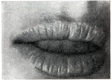 Ранние клинические симптомы — поражения слизистых оболочек рта и кожи. Возникают: ангулярный стоматит — поражение слизисто-кожного соединения в углах рта, характеризующееся побледнением слизистых оболочек, мацерацией эпителия, образованием поперечных трещин, покрытых желтоватыми влажными корочками, покраснением и изъязвлением кожи в углах рта; хейлоз — десквамация эпителия слизистой оболочки в месте смыкания губ, отмечается резкое покраснение красной каймы губ, трещины, расположенные вертикально (рис. 1 и 2), кровянистые корки с последующим рубцеванием; глоссит — поверхность языка вначале зернистая вследствие увеличения грибовидных сосочков, затем сглаженная, язык пурпурного цвета, блестящий. Больные ощущают боль и жжение языка, особенно при приеме пищи. В дальнейшем возникают изменения кожи в виде себорейного дерматита крыльев носа, носо-губных складок, век и ушных раковин с мягким шелушением; ороговение выводных протоков сальных желез («акулья кожа»); сухой зудящий дерматит кистей рук, мошонки, вульвы и заднего прохода. Поу ражение глаз сопровождается конъюнктивитом, нарушением адаптации к темноте, околороговичной инъекцией сосудов, очагами помутнения в роговице, светобоязнью, слезотечением, резью и жжением в глазах, блефароспазмом. Возникают нарушения кроветворения — гипохромная анемия. Наблюдаются нарушения со стороны нервной системы: апатия, головные боли, парестезии, особенно в ногах («жжение ступней»), ретробульбарный неврит, частичная атрофия зрительного нерва; повышение коленного и ахиллова рефлексов, положительный симптом Ромберга, атаксия, клонические судороги. Симптомы со стороны органа зрения и нервной системы встречаются не во всех случаях арибофлавиноза. Их появление и выраженность, повидимому, связаны с длительностью заболевания и степенью трофических нарушений.