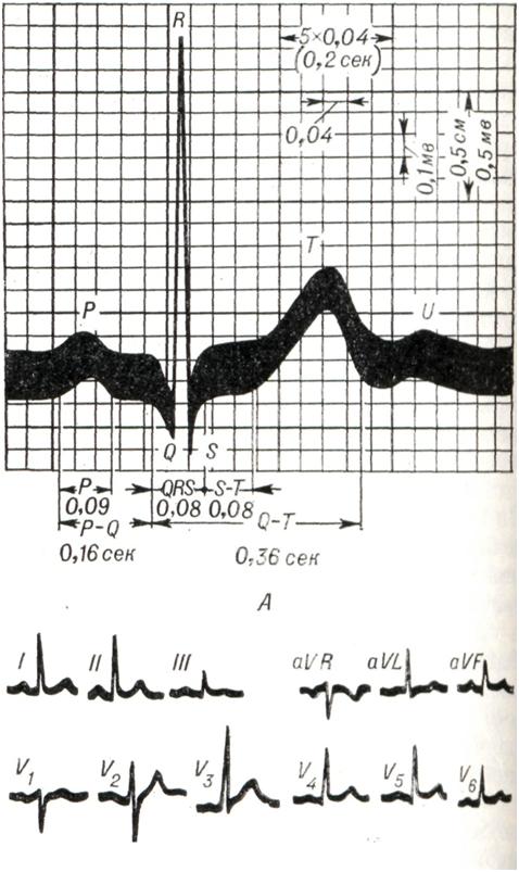 А — Схематическое изображение электрокардиограммы (ЭКГ). Р — зубец, отражающий ход распространения возбуждения по предсердию, интервал Р—Q — время прохождения возбуждения по атриовентрикулярному соединению. QRST — желудочковый комплекс электрокардиограммы, отражающий распространение возбуждения по желудочкам сердца (комплекс QRS — фаза деполяризации желудочков, сегмент ST — состояние полной деполяризации, зубец Т — фаза поздней быстрой деполяризации). Волна U, происхождение которой точно не установлено, в норме наблюдается не всегда. Длина стороны маленькой клеточки по горизонтали соответствует 0,04 сек., по вертикали -0,1 мв. Б — Электрокардиограмма здорового человека в 12 общепринятых отведениях (в скобках указано, между какими областями тела регистрируется разность потенциалов). I — первое стандартное отведение (правая рука и левая рука); II — второе стандартное отведение (правая рука и левая нога); III — третье стандартное отведение (левая рука и левая нога); aVR, aVLmaVF- «усиленные» отведения от конечностей, при записи которых один электрод («активный») накладывается на правую руку (aVJR), левую руку (aVL) и левую ногу (aVF), а второй электрод («объединенный») является закороченным проводом от электродов, наложенных на две остальные конечности. V — однополюсные грудные электроды, при регистрации которых один из электродов объединяет все три конечности (правую руку, левую руку и левую ногу), а второй («активный») — на переднюю стенку грудной клетки в четвертом межреберье по правому краю грудины (Vх), в четвертом межреберье по левому краю грудины (V2), посередине между положениями V2 и V4 (Vt), в месте пересечения срединноключичной линии и пятого межреберья (V4), на том же уровне по переднеподмышечной линии (V5) и на том же уровне по среднеподмышечной линии (Vв). Асистолия предсердий (остановка предсердий) связана с полным подавлением активности синусового узла, отсутствием в миокарде предсердий гетеротопных очагов возбуждения и отсутствием ретроградной проводимости из желудочков в предсердия или с сино-аурикулярной блокадой. Роль водителя ритма принимают на себя центры автоматизма низших порядков. Возникает так называемый узловой (атрио-вентрикулярный) или желудочковый (идиовентрикулярный) ритм (смотри ниже). Точное распознавание затруднительно: отсутствие пред- сердных комплексов (зубцов Р, волн трепетания или мерцания предсердий) на обычной электрокардиограмме еще не служит доказательством асистолии предсердий (может также наблюдаться при некоторых формах атриовентрикулярного ритма). В сомнительных случаях прибегают к записи внутрипредсердной электрограммы. Лечение неэффективно. Блуждающий водитель ритма в синусовом узле.Этиология и патогенез не известны. Вероятная причина — колебания тонуса парасимпатической нервной системы, что ведет к меняющемуся порядку распространения возбуждения в области синусового узла. Электрокардиографически проявляется меняющейся в разных циклах формой зубца Р (или петли Р векторкардиограммы) при нормальном и одинаковом во всех циклах интервале PQ (R). Миграция водителя ритма в предсердиях. Предположительная причина — колебания тонуса блуждающего нерва. Электрокардиографически проявляется меняющейся формой зубца Р и петли Р векторкардиограммы и изменениями интервала PQ (R) в разных сердечных цикл